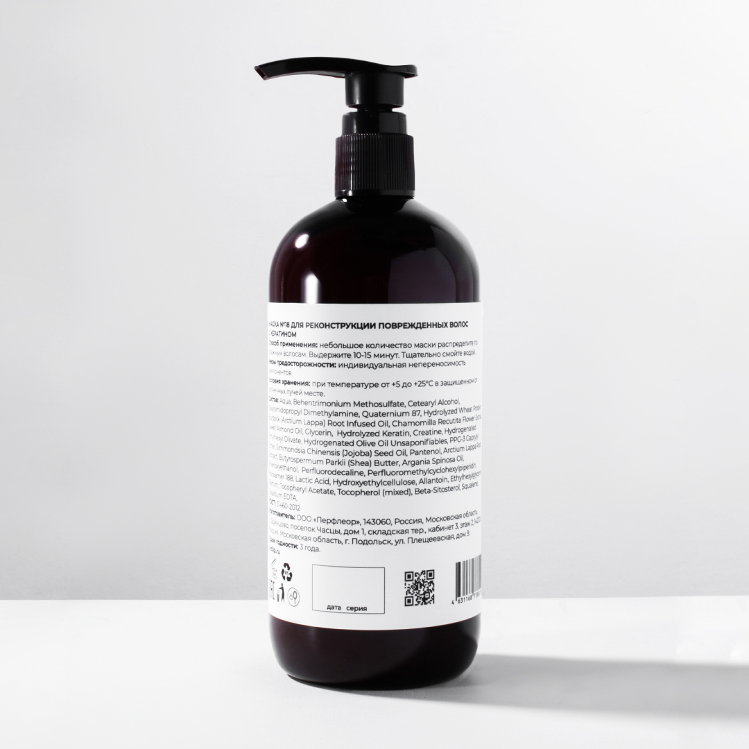 Состав: ПФО-Эмульсия (Poloxamer 188, Perfluorodecaline, Perfluoromethylcyclohexylpiperidin), Aqua, Behentrimonium Methosulfate, Cetearyl Alcohol, Stearamidopropyl Dimethylamine, Quaternium 87, Hydrolyzed Keratin, Creatine, Glycerin, Hydrolyzed Wheat Protein, Chamomilla Recutita (Camomile), Extract, Hydrogenated Ethylhexyl Olivate ,Hydrogenated Olive, Oil Unsaponifiables, Phenoxyethanol, PPG-3 Caprylyl Ether, Simmondsia Chinensis (Jojoba) Seed Oil, Pantenol, Arctium, Lappa Root Extract, Sweet Almond Oil, Burdock (Arctium Lappa) Root Infused Oil, Butyrospermum Parkii (Shea) Butter, Argania Spinosa (Argan) Oil, Tocopheryl Acetate, Lactic Acid, Ethylhexylglycerin, Hydroxyethylcellulose, Allantoin, Tocopherol (mixed), Beta-Sitosterol, Squalene, Disodium EDTA.
