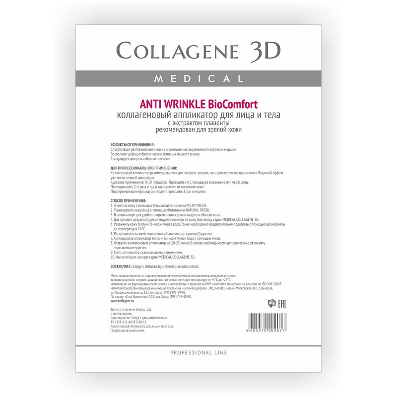 Аппликатор для лица и тела BioComfort ANTI WRINKLE с плацентолью А4,, COLLAGENE 3D Medical
