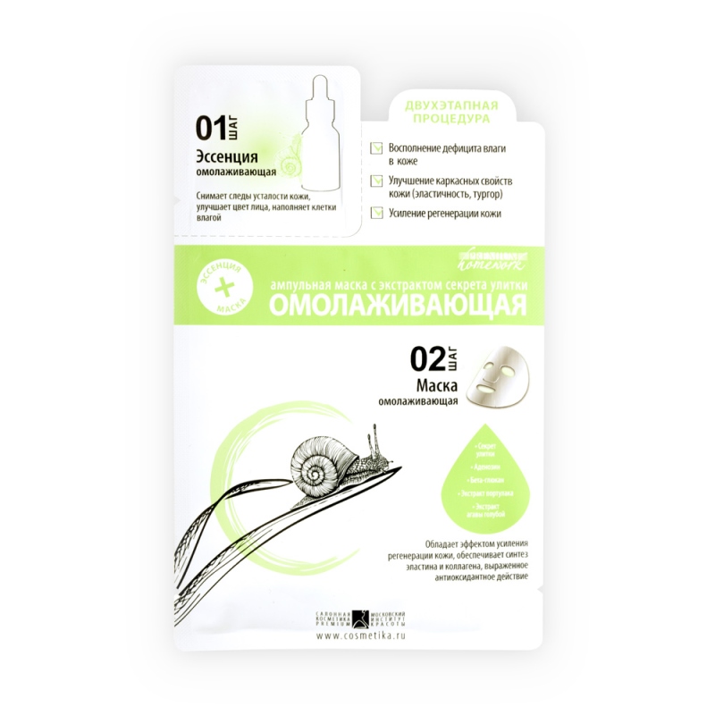 Ампульная маска с экстрактом секрета улитки «Омолаживающая» — двухэтапная, состоит из эссенции и черной маски. В состав маски входят секрет улитки, аденозин, бета-глюкан, экстракты портулака и голубой агавы, которые восполняют дефицит влаги в коже, улучшают каркасные свойства кожи (эластичность, тургор) и усиливают ее регенерацию. 1 шаг. Эссенция омолаживающая, 2 мл Снимает следы усталости кожи, улучшает цвет лица, наполняет клетки влагой. 2 шаг. Маска омолаживающая, 25 мл Решает проблемы увядания уже с первого применения, усиливает синтез эластина и коллагена в коже, обладает выраженными антиоксидантным, иммуномодулирующим и детокс-эффектом. Герметичная упаковка позволяет не добавлять консерванты. Исключена передозировка препаратом — концентрированная эссенция рассчитана на одно применение. Почти мгновенный эффект. После сеанса не требуется наложения кремов, тонизирования. Результат применения: улучшение цвета кожи, увеличение эластичности, увлажнение. Устранение следов усталости, тонизирование. Уменьшение количества и глубины морщин. Показания к применению: Омолаживающая ампульная маска для лица обладает почти мгновенным эффектом. Тонизирует кожу, увлажняет, повышает эластичность, оказывает антиоксидантное действие. Основные активные компоненты: секрет улитки, аденозин, бета-глюкан, экстракт портулака, экстракт агавы голубой. Способ применения: Шаг 1. Нанести эссенцию на очищенную кожу, равномерно распределить по всему лицу. Шаг 2. До того, как эссенция впитается, достать маску из упаковки и поместить её на лицо. Снять маску через 15–20 минут и мягко распределить остатки эмульсии по кожным линиям. *Внешний вид товара может отличаться от фотографий на сайте