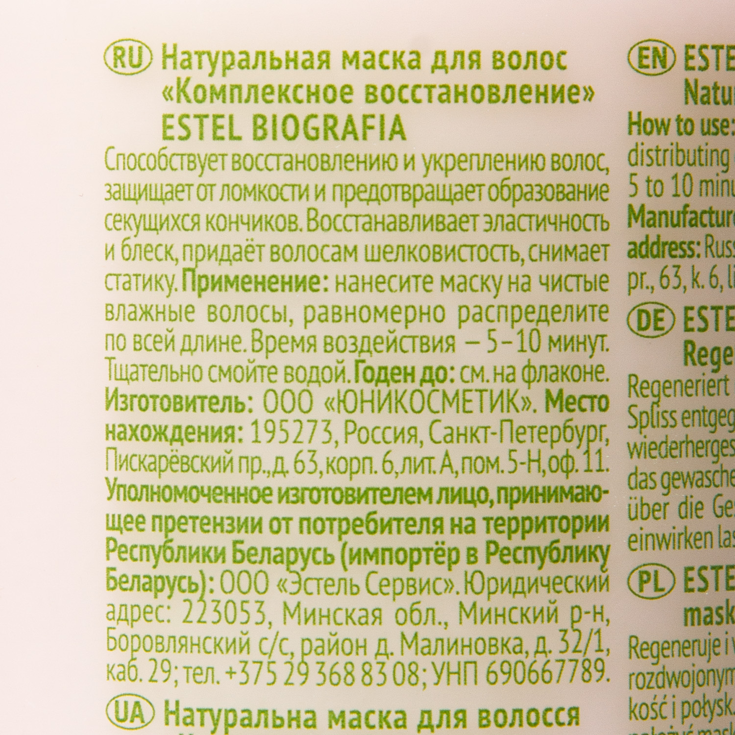 Маска способствует восстановлению и укреплению волос, восстанавливает эластичность и блеск.