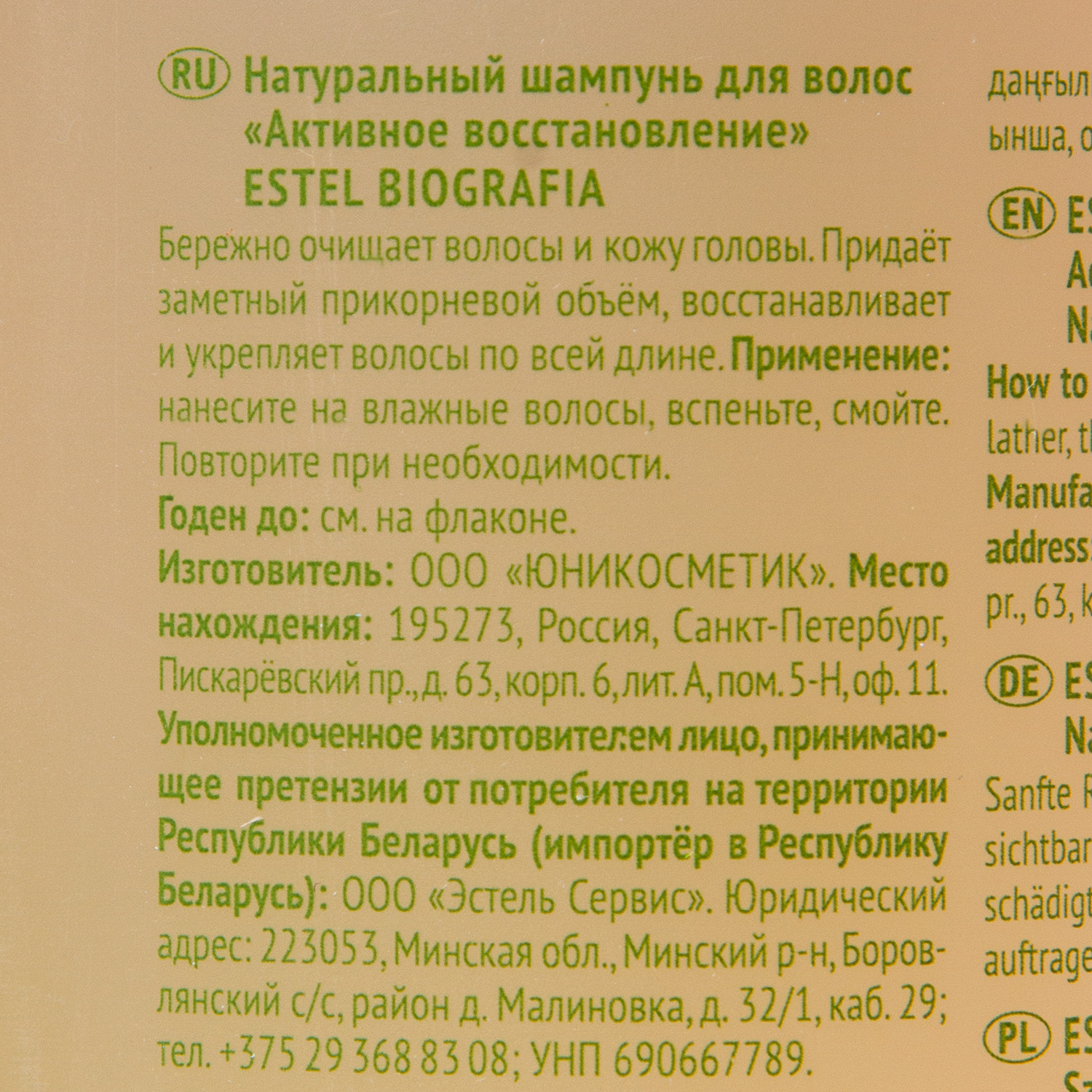 Натуральный шампунь для волос «Активное восстановление», 400 мл ESTEL
