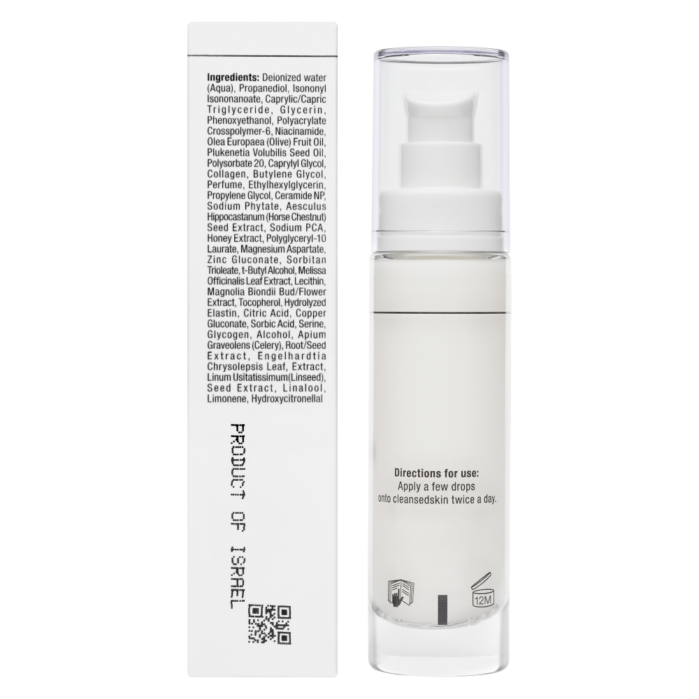 Состав: Caprylic/Capric Triglyceride, Deionized water (Aqua), Isononyl Isononanoate, Propylene Glycol, Citric Acid, Glycogen, Phenoxyethanol, Caprylyl Glycol, Serine, Aesculus Hippocastanum (Horse Chestnut) Seed Extract, Alcohol, Apium Graveolens (Celery) Root/Seed Extract, Butylene Glycol, Ceramide NP, Collagen, Copper Gluconate, Engelhardtia Chrysolepsis Leaf Extract, Ethylhexylglycerin, Glycerin, Honey Extract, Hydrolyzed Elastin, Hydroxycitronellal, Lecithin, Limonene, Linalool, Linum Usitatissimum (Linseed) Seed Extract, Magnesium Aspartate, Magnolia Biondii Bud/Flower Extract, Melissa Officinalis Leaf Extract, Niacinamide, Olea Europaea (Olive) Fruit Oil, Perfume, Plukenetia Volubilis Seed Oil, Polyacrylate Crosspolymer-6, Polyglyceryl-10 Laurate, Polysorbate 20, Propanediol, Sodium PCA, Sodium Phytate, Sorbic Acid, Sorbitan Trioleate, t-Butyl Alcohol, Tocopherol, Zinc Gluconate.