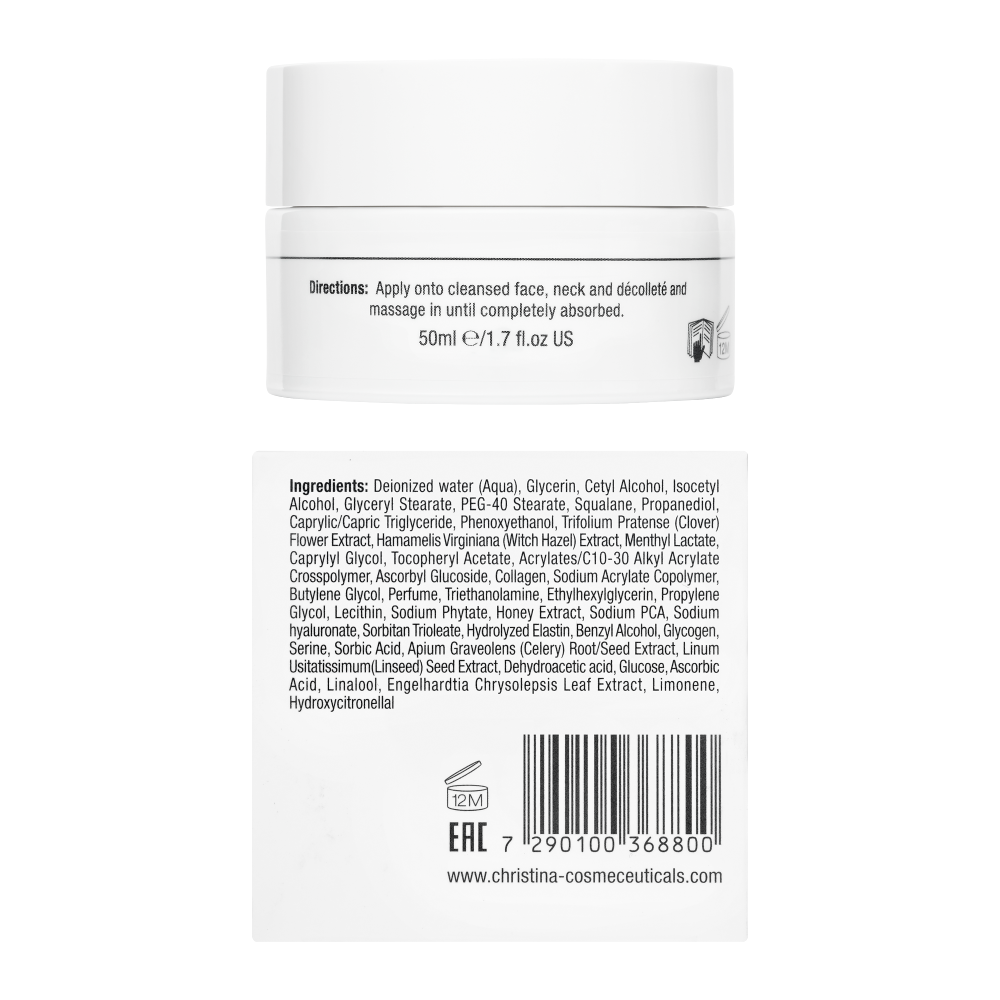 Состав: Caprylic/Capric Triglyceride, Deionized water (Aqua), Propylene Glycol, Linum Usitatissimum(Linseed) Seed Extract, Ascorbic Acid, Glycogen, Phenoxyethanol, Caprylyl Glycol, Serine, Acrylates/C10-30 Alkyl Acrylate Crosspolymer, Apium Graveolens (Celery) Root/Seed Extract, Ascorbyl Glucoside, Benzyl Alcohol, Butylene Glycol, Cetyl Alcohol, Collagen, Dehydroacetic acid, Engelhardtia Chrysolepsis Leaf Extract, Ethylhexylglycerin, Glucose, Glycerin, Glyceryl Stearate, Hamamelis Virginiana (Witch Hazel) Extract, Honey Extract, Hydrolyzed Elastin, Hydroxycitronellal, Isocetyl Alcohol, Lecithin, Limonene, Linalool, Menthyl Lactate, PEG-40 Stearate, Perfume, Propanediol, Sodium Acrylate Copolymer, Sodium hyaluronate, Sodium PCA, Sodium Phytate, Sorbic Acid, Sorbitan Trioleate, Squalane, Tocopheryl Acetate, Triethanolamine, Trifolium Pratense (Clover) Flower Extract.