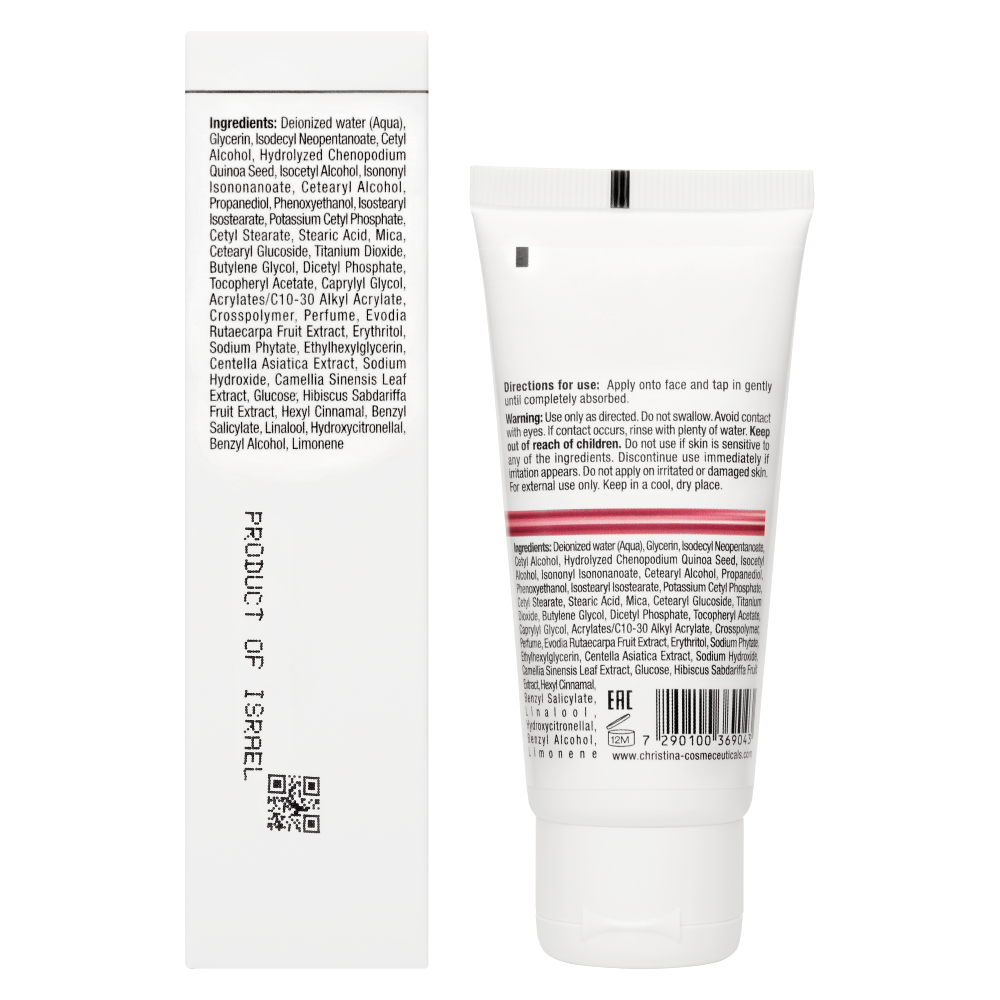 Активные компоненты: комплекс Radiance enhancer, комплекс Skin tightener, комплекс Botanical hydrator, комплекс Moisture complex, глицерин, масло киноа, минералы, диоксид титана, витамин Е, экстракт эводии рутоплодной, экстракт центеллы азиатской, экстракт зеленого чая, экстракт гибискуса.