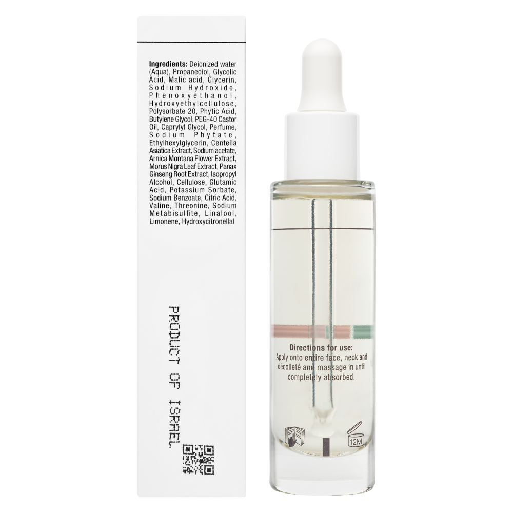 Активные компоненты: AHA 6%, гликолевая кислота, яблочная кислота, экстракт женьшеня, фитиновая кислота, экстракт арники, комплекс Energy booster, экстракт центеллы азиатской, экстракт шелковицы, аминокислоты (валин, треонин, глутамин).