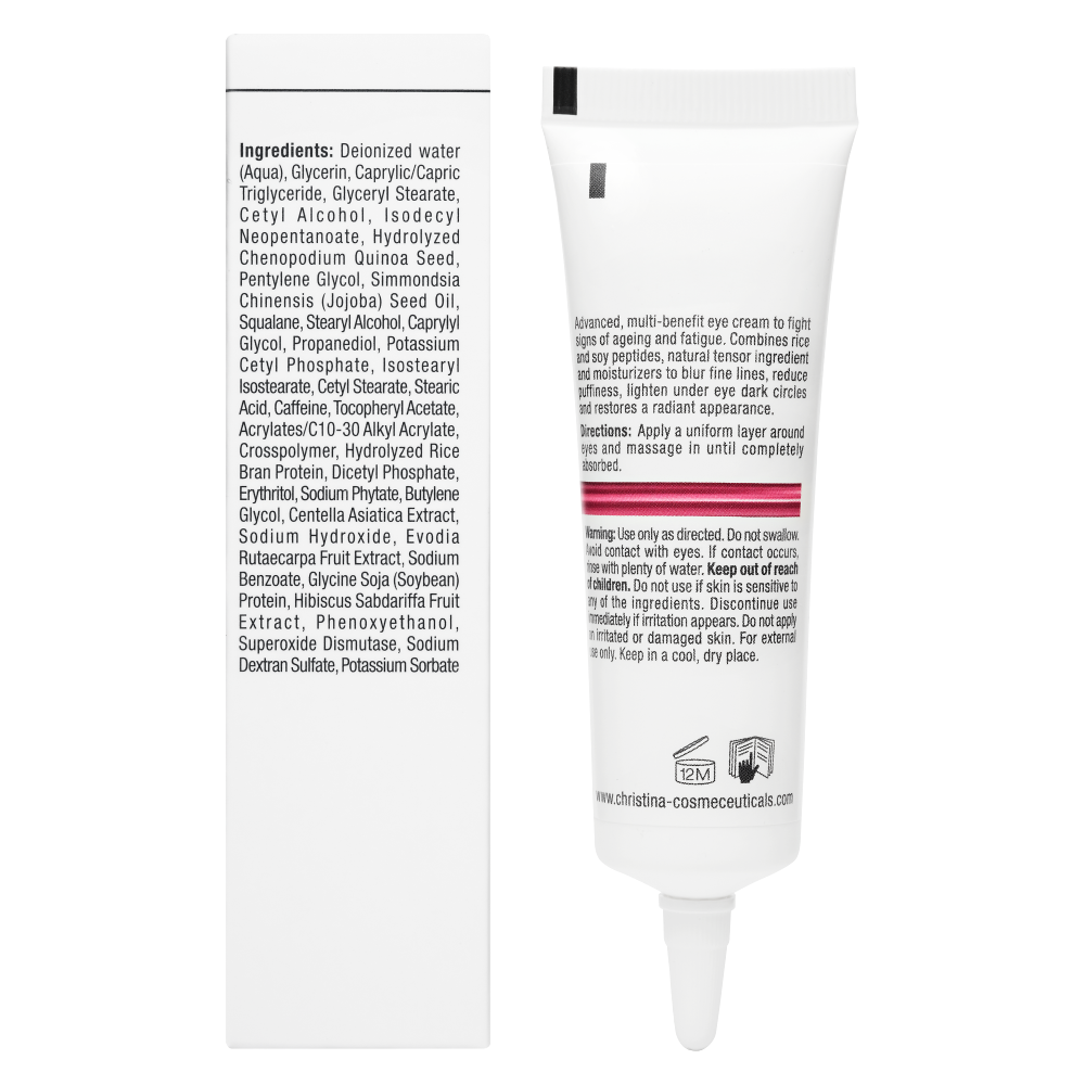 Активные компоненты: Комплекс Eye beautifier (пептиды сои, супероксиддисмутаза), комплекс Skin tightener, комплекс Botanical hydrator, экстракт центеллы азиатской, кофеин, витамин Е, гидролизованный рисовый протеин, экстракт эводии рутоплодной, экстракт гибискуса.