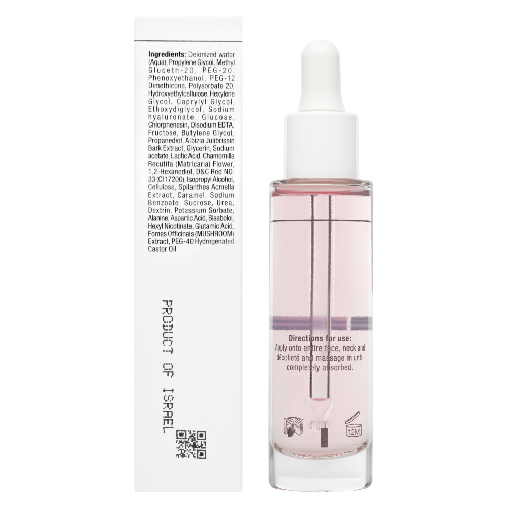 Состав: Deionized water (Aqua), Propylene Glycol, Chlorphenesin, Phenoxyethanol, Caprylyl Glycol, 1,2-Hexanediol, Alanine, Albizia Julibrissin Bark Extract, Aspartic Acid, Bisabolol, Butylene Glycol, Caramel, Cellulose, Chamomilla Recutita (Matricaria) Flower, D&C Red NO. 33 (CI 17200), Dextrin, Disodium EDTA, Ethoxydiglycol, Fomes Officinais (MUSHROOM) Extract, Fructose, Glucose, Glutamic Acid, Glycerin, Hexyl Nicotinate, Hexylene Glycol, Hydroxyethylcellulose, Isopropyl Alcohol, Lactic Acid, Methyl Gluceth-20, PEG-12 Dimethicone, PEG-20, PEG-40 Hydrogenated Castor Oil, Polysorbate 20, Potassium Sorbate, Propanediol, Sodium acetate, Sodium Benzoate, Sodium hyaluronate, Spilanthes Acmella Extract, Sucrose, Urea.