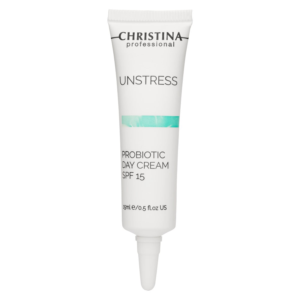 - Unstress Probiotic Day Cream SPF 15 – Дневной крем с пробиотическим действием SPF 15, 15 мл – предотвращает преждевременное старение кожи от УФ и голубого излучения гаджетов. Содержит успокаивающие кожу пробиотический комплекс и растительные антиоксиданты.