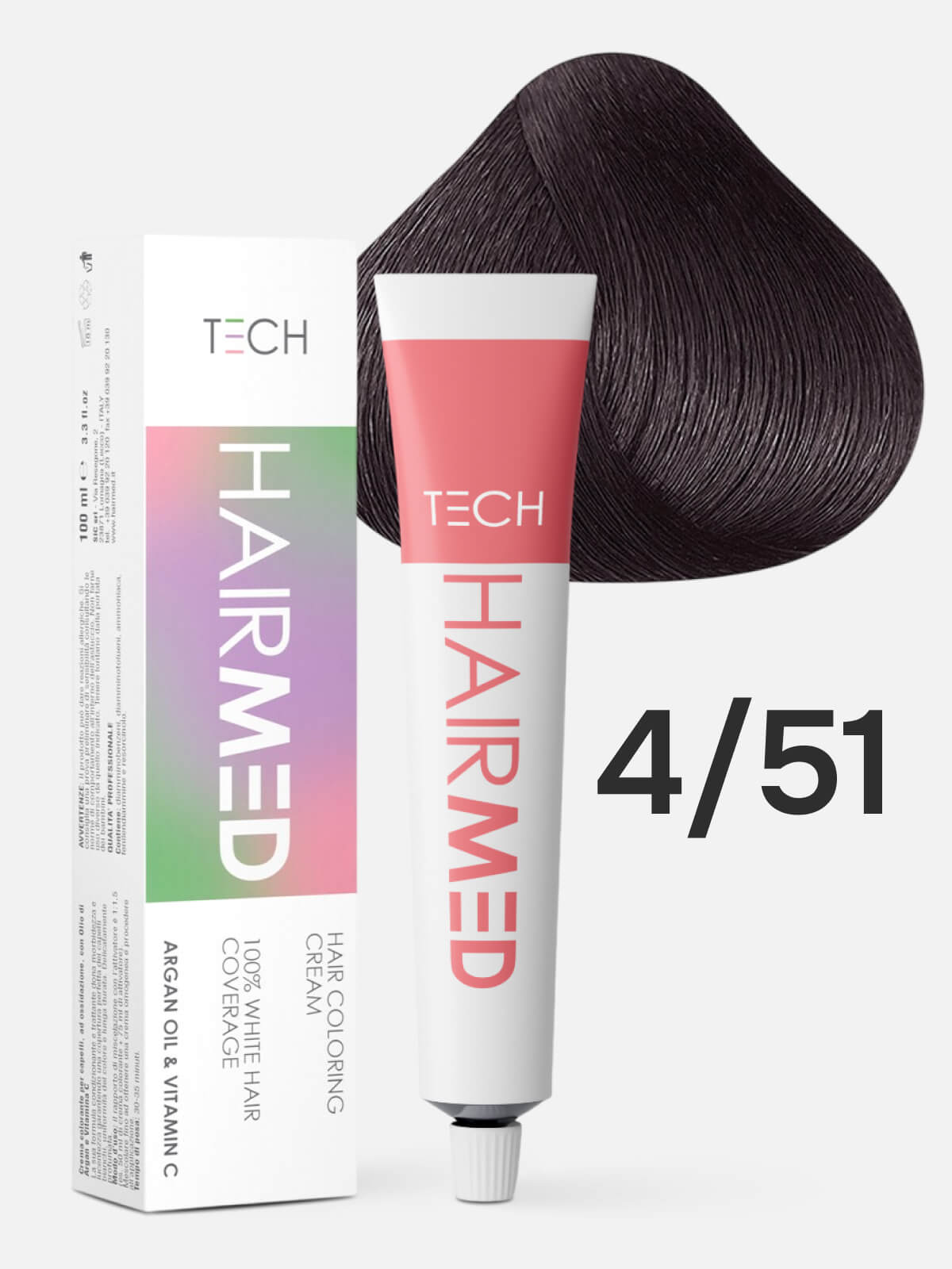Перманентная крем-краска для волос HAIRMED Tech Hair Coloring Cream 4.51 с аргановым маслом, экстрактом цветков ромашки, глицерином и витамином С. Палитра включает в себя насыщенные, блестящие и переливающиеся оттенки, которые обеспечивают 100% покрытие седины и стойкость до 6-8 недель. Аргановое масло интенсивно питает волосы, защищает их от повреждения в процессе окрашивания, а также предотвращает выцветание пигментов от УФ-лучей. Экстракт ромашки укрепляет кутикулу волоса и защищает кожу головы от раздражения, зуда и шелушения. Глицерин и витамин С увлажняют структуру волос, нейтрализуют окислительные процессы и оказывают Anti-age эффект.