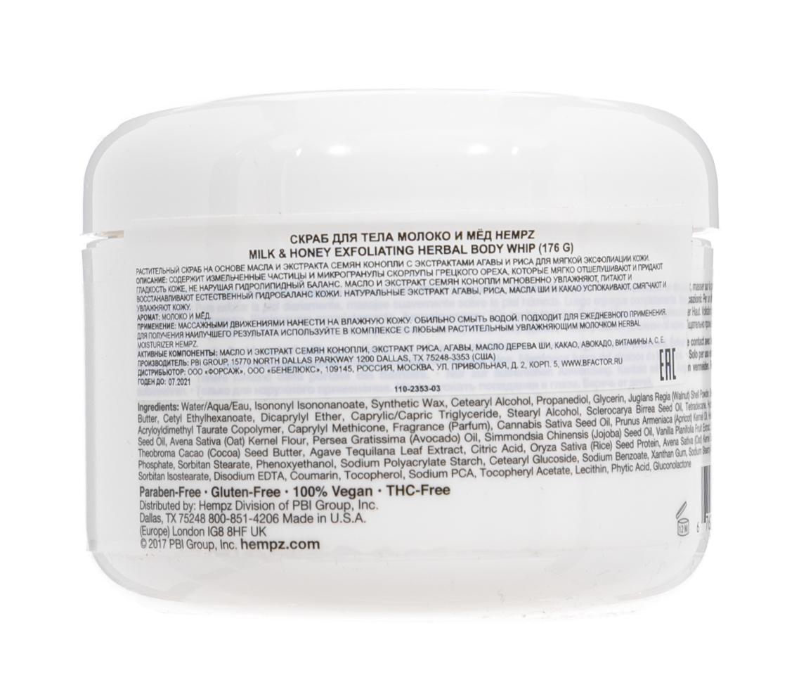 Для мягкой эксфолиации кожи. Содержит измельченные частицы и микрогранулы скорлупы грецкого ореха, которые мягко отшелушивают и придают гладкость коже, не нарушая гидролипидный баланс. Масло и экстракт семян конопли мгновенно увлажняют, питают и восстанавливают естественный гидробаланс кожи. Активные компоненты: Масло семян конопли, экстракт семян конопли, экстракт жожоба, экстракт риса, экстракт агавы, масло дерева ши, масло какао, масло авокадо, витамин А, витамин С, витамин Е. Применение: Массажными движениями нанести на влажную кожу, обильно смыть водой. Для получения наилучшего результата используйте в комплексе с любым увлажняющим молочком или кремом питательным Hempz body. Подходит для ежедневного применения.