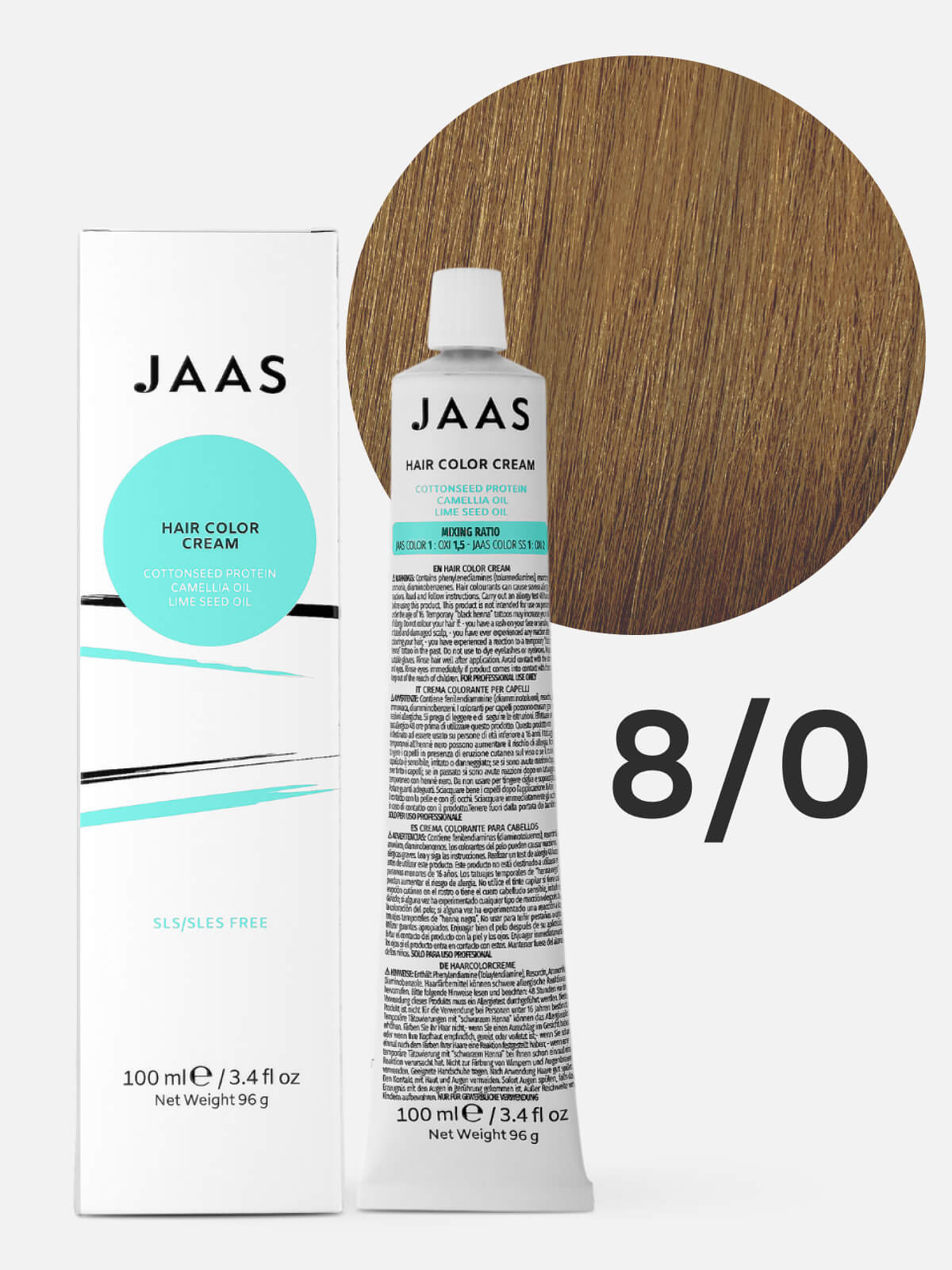JAAS Hair Color Cream 8.0 — это перманентная краска для волос, которая обеспечивает питание и уход во время окрашивания.