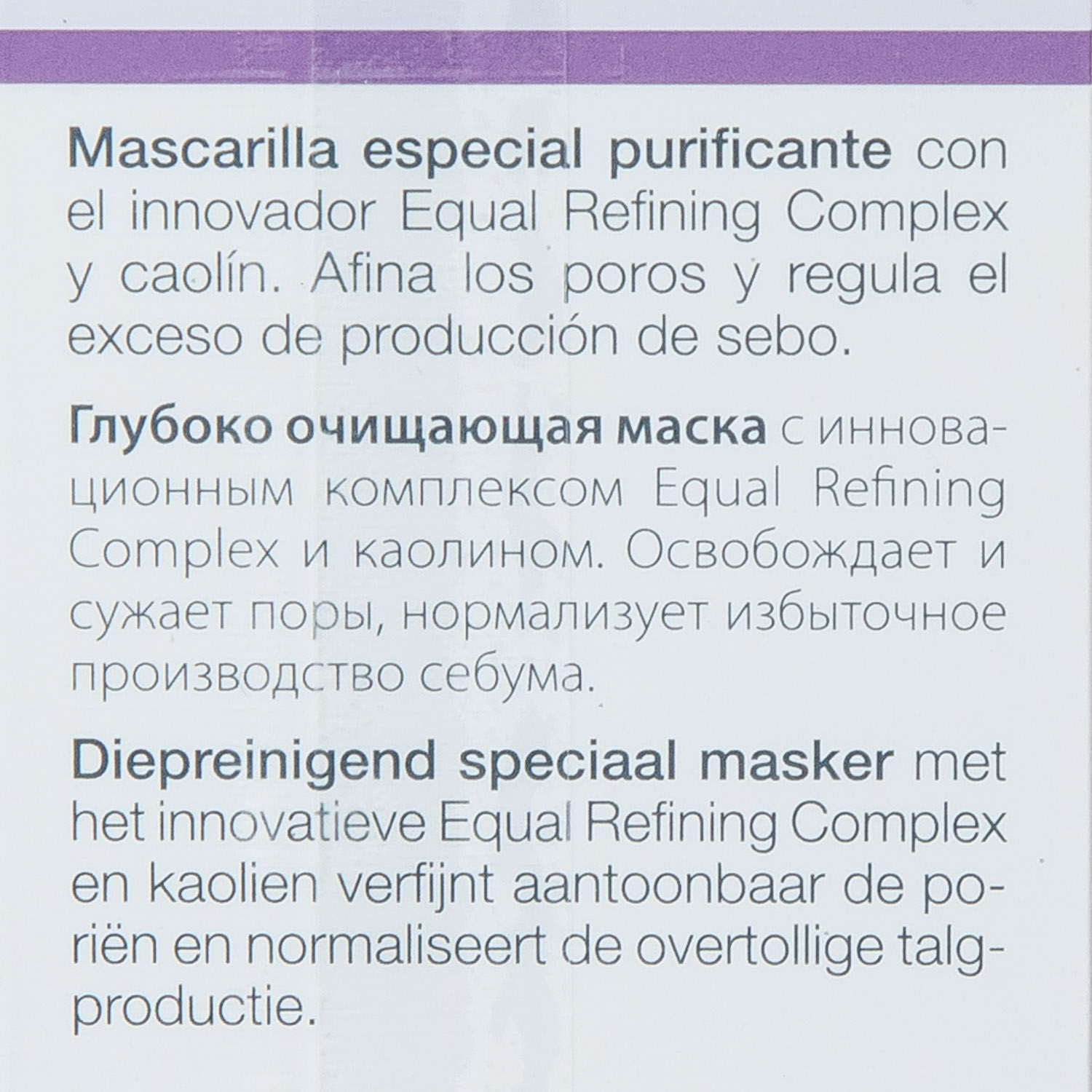 - Equal-Refining Complex (комбинация олеанолевой кислоты и экстракта из коры Enantia Chlorantha) подавляет активность фермента 5-альфа-редуктазы и снижает выработку кожного сала, уменьшая жирный блеск на 21,7% и размер пор на 16% через 28 дней применения