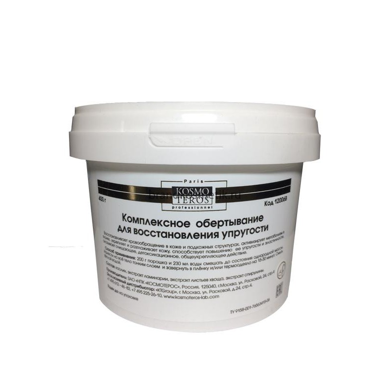 Обертывание для упругости от бренда Kosmoteros восстанавливает кровообращение в коже и подкожных структурах активизирует метаболизм в тканях укрепляет и разглаживает кожу способствует повышению ее упругости и эластичности. Обертывания в целом оказывают на организм очищающее детоксикационное общеукрепляющее действие дарят прилив сил и улучшение настроения. Основные активные компоненты: Ламинария digitata — проникая в кожу ведёт активную работу на клеточном уровне участвуя в обменных процессах и тем самым улучшая состояние даже самой проблемной кожи. Морская водоросль участвует во всех обменных процессах работает на клеточном уровне. Процедуры на основе ламинарии очищают кожу от отмерших частичек тем самым позволяя ей дышать и получать питательные вещества. Ламинария также восстанавливает поврежденные клетки. Спирулина Lessjnia и Lithothamnium — интенсивно насыщают кожу полезными веществами стимулируют клеточную активность и регенерацию а также оказывают мощное укрепляющее и лифтинговое действие. Каолин — обладает ярковыраженными абсорбирующим и обволакивающим действием благодаря чему глубоко проникает и очищает поры нормализует работу сальных желез выводит шлаки и токсины одновременно обеспечивая оптимальный уровень обменных процессов в коже поддерживает необходимый уровень увлажнения кожи насыщая её микроэлементами дезинфицируя и слегка отбеливая. Обезвествлённые морские водоросли — содержат в себе целый комплекс полезных веществ. Бета-каротин входящий в состав водорослей достигает 60-70% общего содержания. Кроме этого водоросли обогащены насыщенными жирными кислотами глицеролом и другими полезными природными компонентами. Способствуют обновлению клеток омолаживают и оздоровляют их структуру помогают бороться со свободными радикалами придавая коже упругость и эластичность. Способ применения: 200г порошка и 340 мл воды смешать до состояния однородной массы. Нанести на всё тело тонким слоем и завернуть в плёнку и/или термоодеялона 15-30 минут. Смыть тёплой водой.