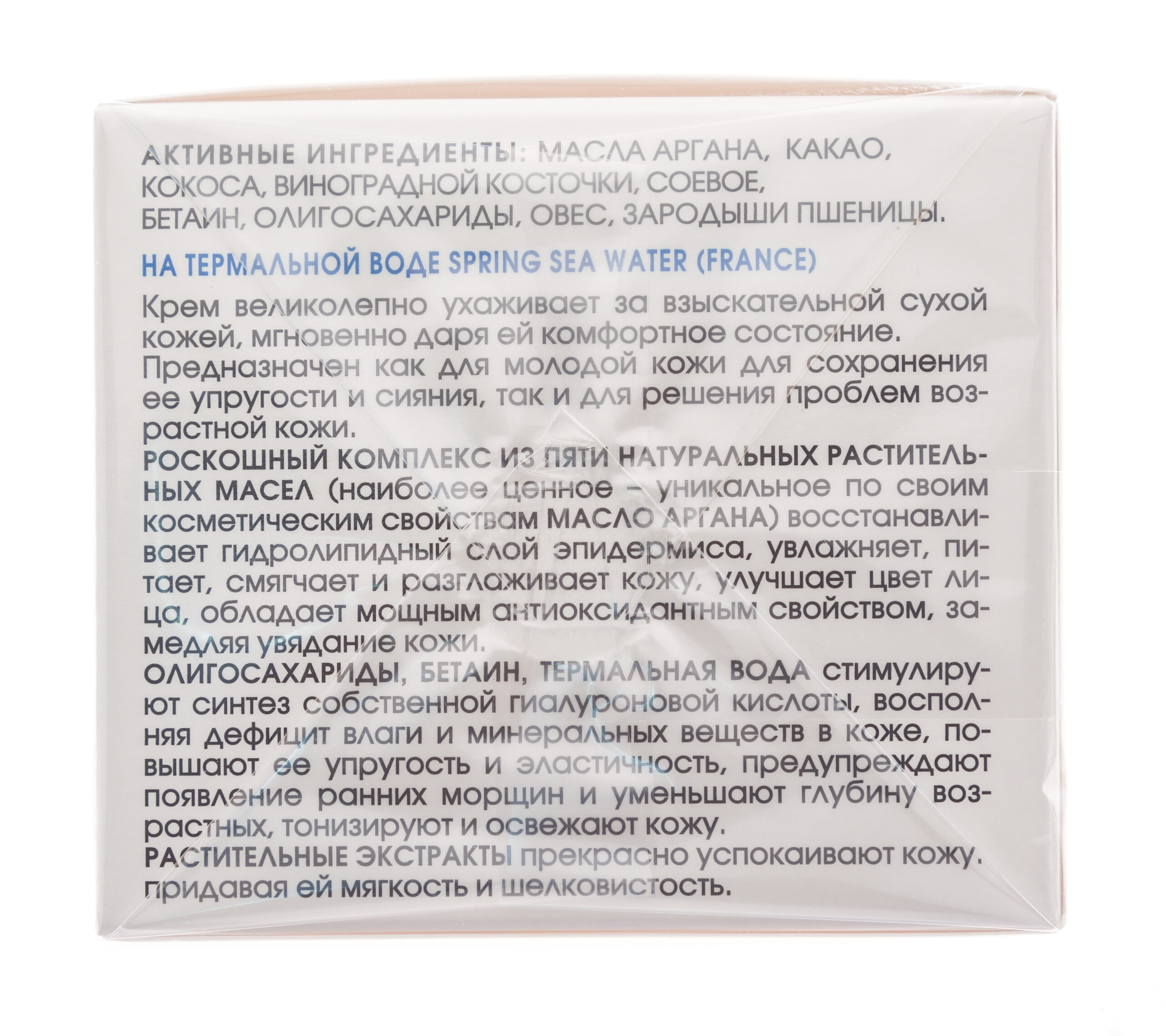 Крем для лица с маслом арганы разработан специально для сухой и обезвоженной кожи. Он интенсивно увлажняет, увеличивает степень эластичности и упругости кожи, улучшает цвет лица, питает и защищает кожу от агрессивных воздействий окружающей среды. Крем для сухой кожи с маслом аргана идеален для ежедневного ухода. Комплекс из 5 натуральных масел помогает восстановить естественный баланс увлажненности кожи, насыщает ценными микроэлементами, оказывает защитное и антиоксидантное действие, позволяя продлить молодость кожи, защитить ее от преждевременного увядания. Термальная вода, бетаин и олигосахариды обогащают клетки минеральными веществами и влагой, повышают упругость кожи, предотвращают возникновение новых морщин и уменьшают глубину существующих. Экстракты растений обладают успокаивающим действием, сохраняют нежность и гладкость кожи. Результат: кожа нежная, гладкая, упругая. Активные ингредиенты: Масла аргана, какао, кокоса, виноградной косточки, соевое, бетаин, олигосахариды, овес, зародыши пшеницы. Применение: Чистое лицо слегка увлажнить термальной водой или тоником, затем легкими движениями пальцев нанести крем и дать ему полностью впитаться. При очень сухой коже крем можно применять как питательную маску. Для этого крем распределяют по коже плотным слоем, оставляют на 10-15 минут и остатки убирают салфеткой.