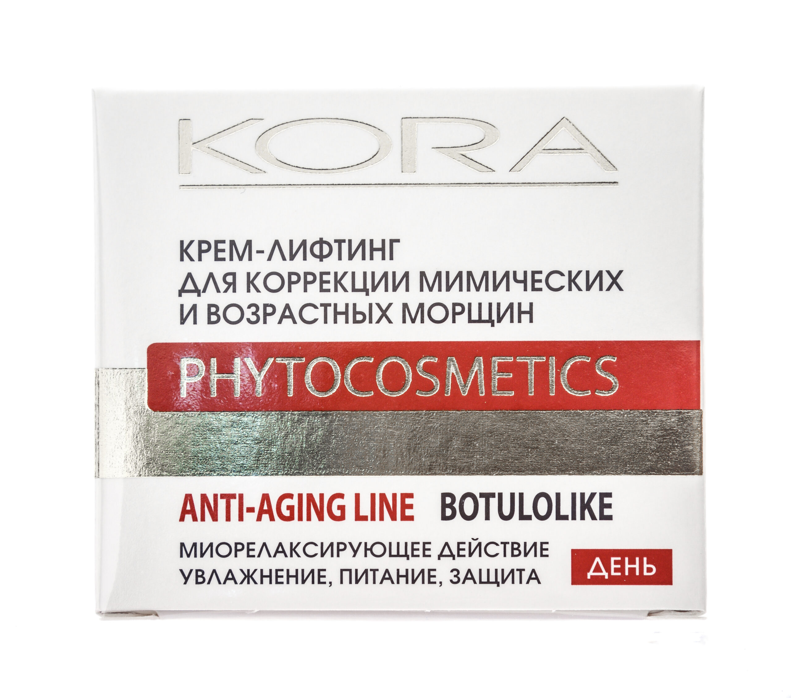 Крем-лифтинг для коррекции мимических морщин KORA разработан для зрелой кожи и рекомендуется к применению после 30 лет. Комплекс растительных миорелаксантов снимает напряжение мышц лица, укрепляет овал и делает морщины менее заметными. Экстракт морских водорослей и полисахариды цикория моделируют овал лица и повышают упругость кожи. Вербена препятствуетобразованию новых морщин и разглаживает существующие. Термальная вода и суперувлажняющий комплекс поддерживают оптимальный гидробаланс в клетках эпидермиса и увеличивают их защитные свойства. Результат: кожа лица выглядит гладкой и упругой, приобретает свежесть и сияние. Активные ингредиенты: Глюконат магния, мальтоза, водоросли, корень цикория, гиалуроновая кислота, вербена, имбирь, анис, лист земляники, масла ши, авокадо, соевое, суперувлажняющий комплекс. Применение: Лифтинг-крем используют утром, нанося его на тщательно очищенную кожу, увлажненную термальной водой или тоником. Полный курс применения – два-четыре месяца. При наличии выраженных возрастных морщин данный крем рекомендуется комбинировать с ночным кремом для восстановления упругости кожи лица и шеи от KORA.