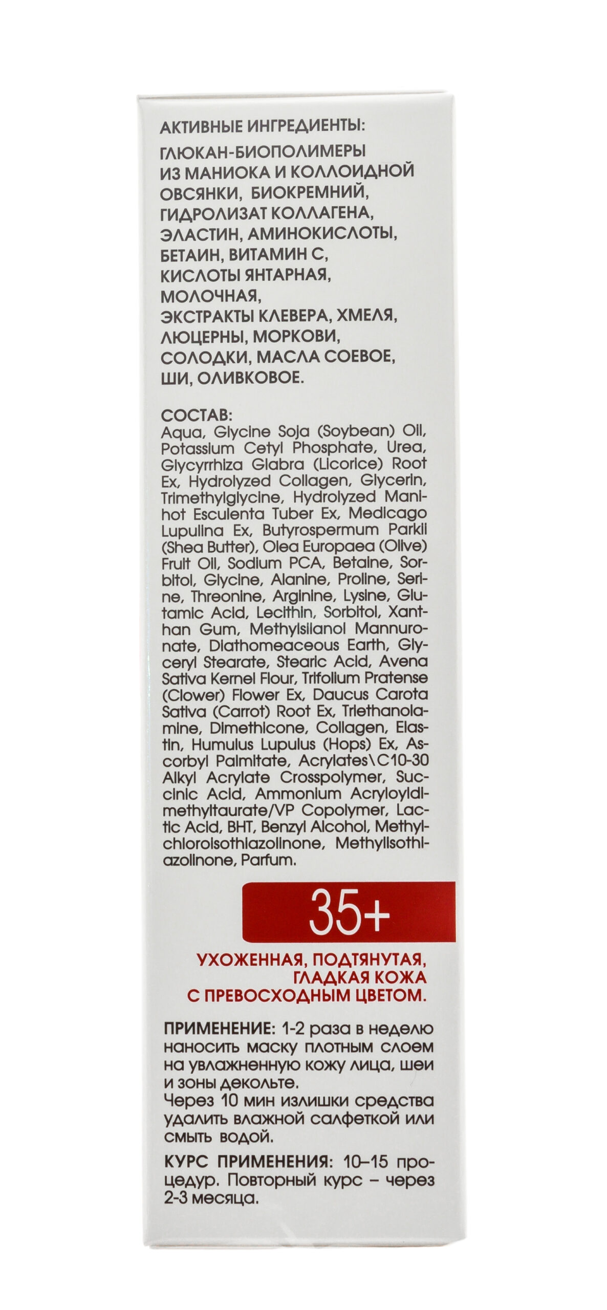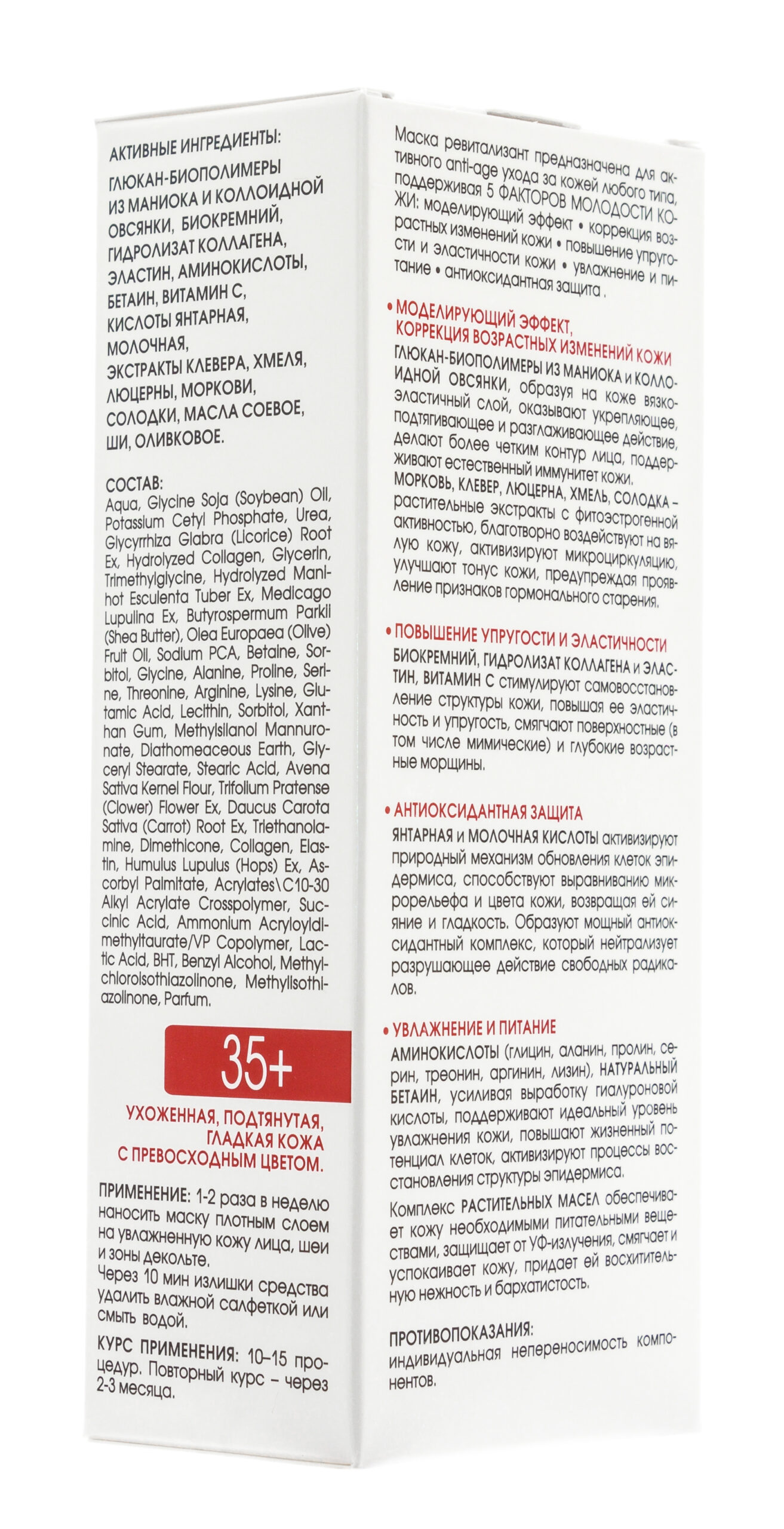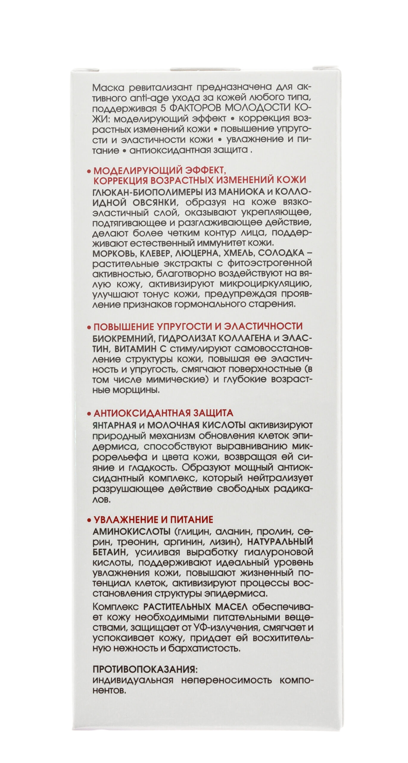 Маска ревитализант великолепно подходит для интенсивного ухода за возрастной кожей. Она позволяет сделать овал лица более подтянутым, а кожу — эластичной и упругой. Маска обеспечивает быстрое обновление клеток, делает морщины менее выраженными и интенсивно питает кожу. Глюкан-биополимеры в составе маски ревитализант 5 факторов молодости кожи укрепляют природный иммунитет клеток, образуют тонкую эластичную пленку, которая делает овал лица более четким, подтягивает и выравнивает кожу. Экстракты растений, имеющие эстрогенную активность, положительно влияют на тусклую, увядающую и усталую кожу, улучшая ее тонус и препятствуя раннему старению. Витамины, биокремний, коллаген и эластин делают морщины менее глубокими, усиливают способность тканей к самоомоложению, увеличивают упругость кожи. Аминокислоты и бетаин стимулируют выработку естественной гиалуроновой кислоты, помогают поддерживать кожу увлажненной, повышают жизнеспособность клеток. А натуральные масла смягчают и успокаивают кожу, защищают от ультрафиолета. Результат: после курса использования маски, который состоит из 10-15 процедур, кожа приобретает упругость, бархатистость, признаки старения становятся менее выраженными, овал лица имеет более четкие контуры. Активные ингредиенты: Глюкан-биополимеры из маниока и коллоидной овсянки, биокремний, гидролизат коллагена, эластин, аминокислоты, бетаин, витамин С, кислоты янтарная, молочная, клевер, люцерна, хмель, морковь, солодка, масла соевое, ши, оливковое. Применение: Маску ревитализант для anti-age ухода рекомендуется использовать два раза в неделю. Ее наносят толстым слоем на увлажненное лицо и шею и оставляют на 15-20 минут, затем смывают водой.
