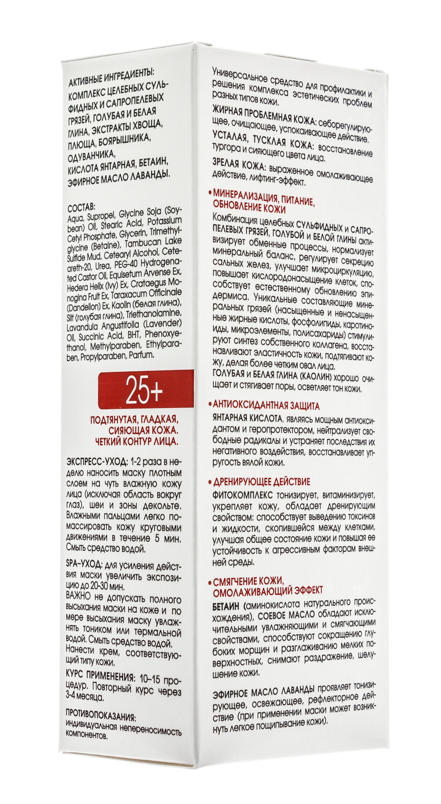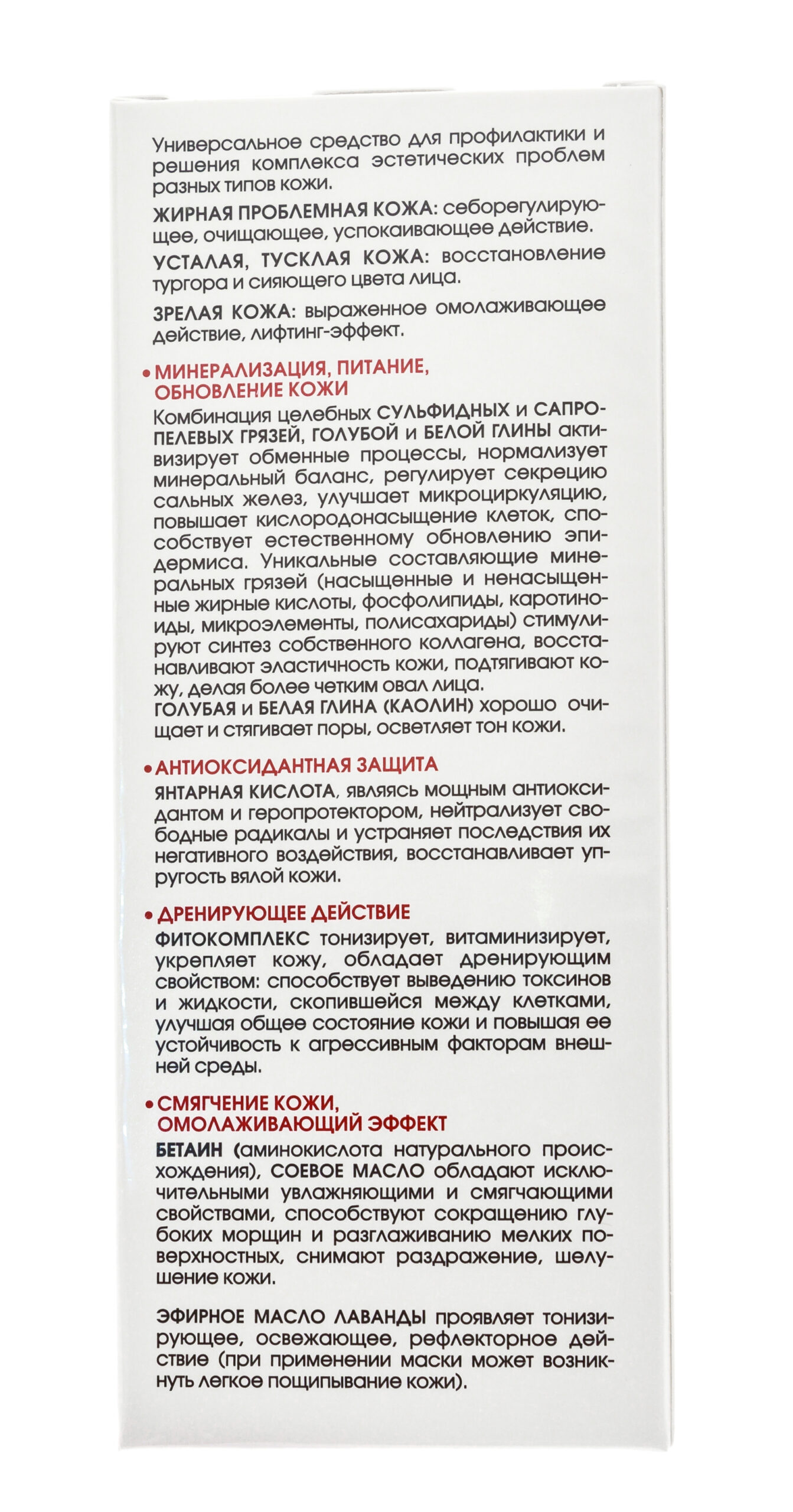 В основе обновляющей маски для лица лежит комплекс лечебных грязей. Они содержат полезные коже макро- и микроэлементы, аминокислоты, липиды, витамины и другие ценные вещества. В состав маски введены экстракты растений и натуральные масла, дополняющие и усиливающие действие грязей. Такая универсальная маска подойдет для всех типов кожи, но особенно понравится тусклой, усталой и увядающей. Она обеспечит интенсивное очищение, увлажнение и питание, смягчит и освежит лицо. Spa-маска обновляющая с органоминеральным комплексом позволит решить эстетические проблемы кожи любого типа. Она деликатно очистит жирную и проблемную кожу, наладит деятельность сальных желез; приведет в тонус тусклую, усталую кожу и вернет ей здоровый цвет; обновит зрелую кожу и создаст эффект лифтинга. Благодаря сочетанию сапропелевых и сульфидных грязей, белой и голубой глины в клетках ускоряются обменные процессы, приходит в норму минеральный баланс, ткани насыщаются кислородом. Кожа получает необходимые фосфолипиды, каротиноиды, полисахариды, улучшается циркуляция крови, повышается выработка коллагена и эластина, быстрее идет регенерация тканей, уменьшаются поры, подтягивается овал лица. Янтарная кислота нейтрализует действие свободных радикалов и приводит в тонус вялую кожу, фитокомплекс выводит токсины, витаминизирует и оказывает укрепляющий эффект, повышает защитные свойства клеток и их устойчивость к негативным внешним факторам. Бетаин, являясь натуральной аминокислотой, в сочетании с соевым маслом увлажняет и смягчает кожу. Результат: после полного курса применения spa-маски для лица (10-15 процедур) кожа выглядит ухоженной, молодой, здоровой и свежей. Активные ингредиенты: Комплекс целебных сульфидных и сапропелевых грязей, голубая и белая глина, хвощ, плющ, боярышник, одуванчик, кислота янтарная, бетаин, эфирное масло лаванды. Применение: Для экспресс-ухода маску для лица spa распределяют равномерным тонким слоем по слегка увлажненной коже, не затрагивая области глаз, через 3-5 минут аккуратно массируют лицо круговыми движениями и смывают теплой водой. Для полноценного интенсивного spa-ухода маску наносят на влажную кожу лица на 25-30 минут. В процессе экспозиции периодически орошают маску тоником или термальной водой. Затем смывают и наносят на лицо крем в соответствии с типом кожи.