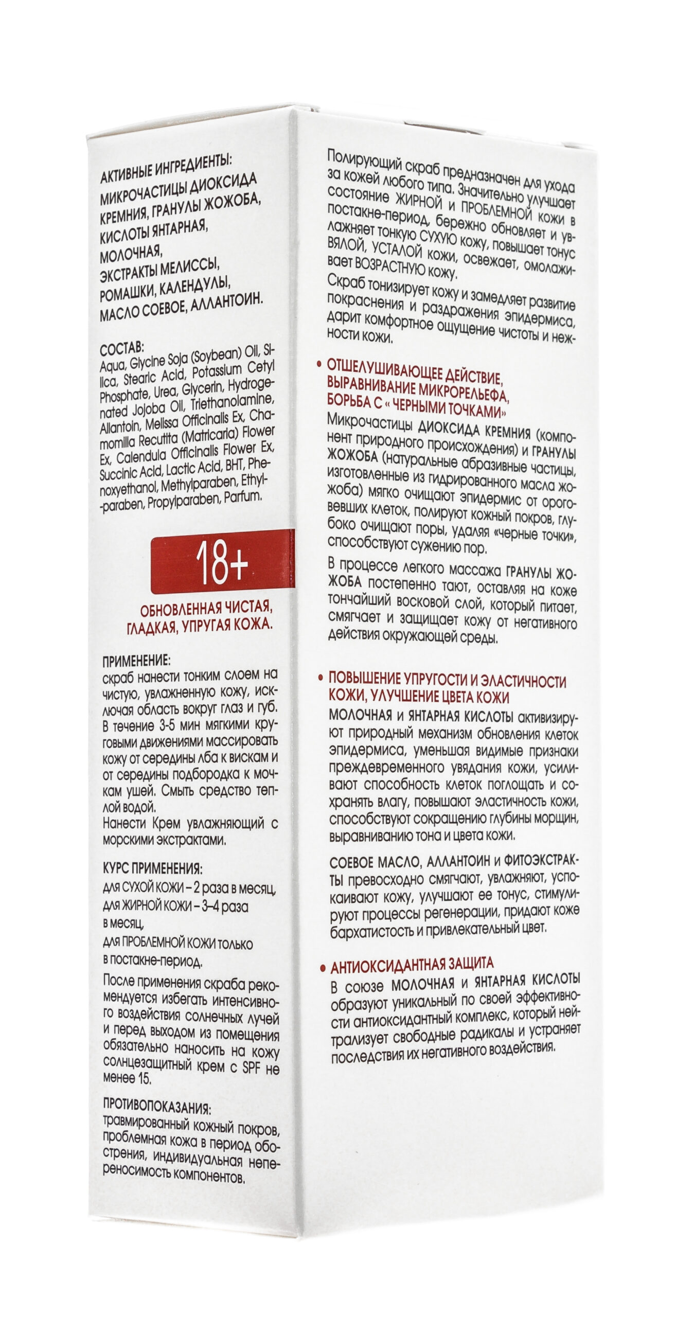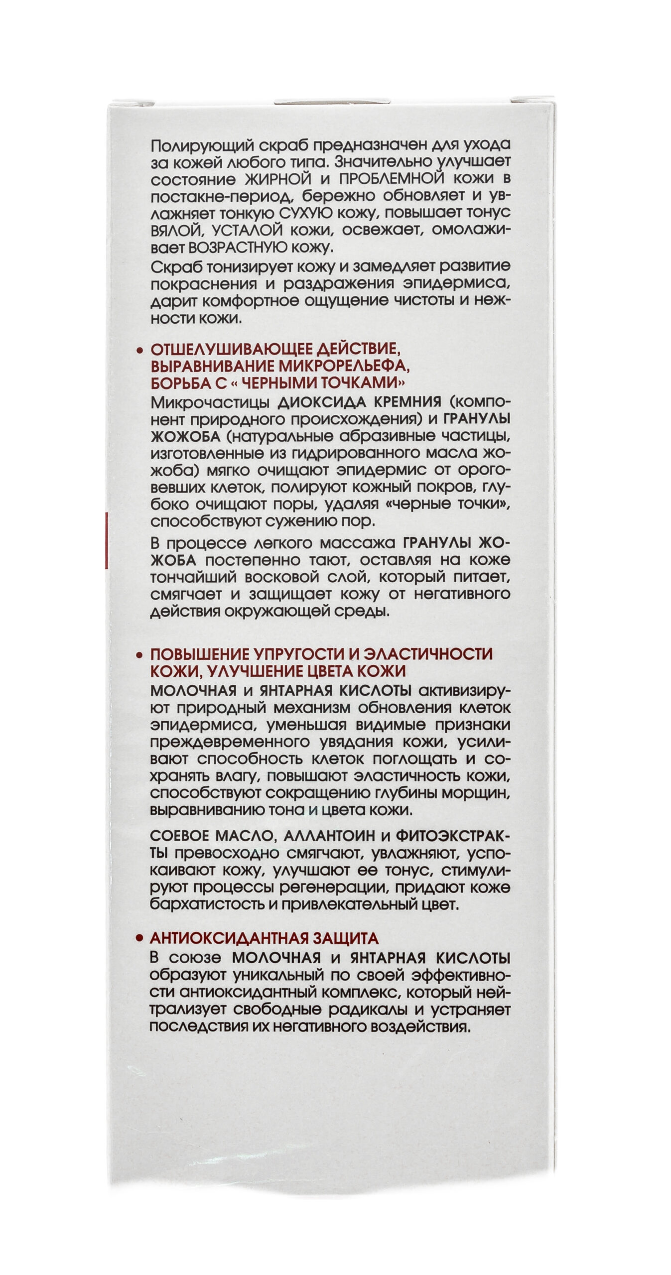 Скраб тройного действия удачно сочетает в себе свойства механического и поверхностного химического пилинга. Он стимулирует интенсивное обновление кожи и борется с комедонами, не травмируя ткани. Скраб для лица заметно улучшит состояние жирной кожи, мягко обновит и увлажнит сухую и нормальную. Частички диоксида кремния и гранулы жожоба, являясь натуральным абразивом, нежно и бережно избавят лицо от ороговевших клеток, тщательно отполируют кожу, сузятпоры и удалят черные точки. Молочная и янтарная кислоты затормозят процессы преждевременного старения, увеличат эластичность и упругость кожи, сократят глубину морщинок. Соевое масло в сочетании с аллантоином и растительными экстрактами смягчат и успокоят кожу, ускорят естественные процессы обновления и подарят лицу свежесть. Результат: кожа чистая, мягкая, гладкая. Активные ингредиенты: Микрочастицы диоксида кремния, гранулы жожоба, кислоты янтарная и молочная, экстракты мелиссы, ромашки, календулы, масло соевое, аллантоин. Применение: Полирующий скраб тройного действия наносится ровным тонким слоем на предварительно очищенное лицо, исключая зону глаз и губ. Легкими круговыми движениями подушечек пальцев аккуратно массировать кожу, смыть остатки средства теплой водой и нанести на лицо крем.