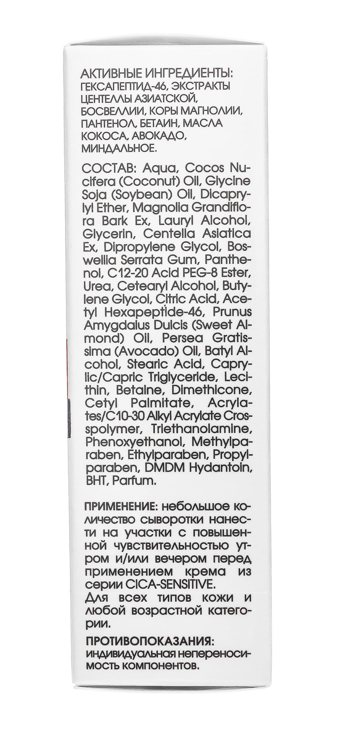 Активная сыворотка с мощным успокаивающим комплексом запускает защитные механизмы клеток кожи, уменьшает дискомфортные ощущения, способствует восстановлению барьерной функции, оказывает антиоксидантное действие. • УСПОКАИВАЮЩЕЕ ДЕЙСТВИЕ, АНТИОКСИДАНТНАЯ ЗАЩИТА гексапептид-46, экстракт коры Магнолии уменьшают интенсивность покраснения, устраняют ощущение стянутости кожи. • АНТИСТРЕССОВОЕ ДЕЙСТВИЕ комплекс центеллы азиатской, босвеллии повышает стрессоустойчивость кожи к агрессивному воздействию окружающей среды, успокаивает кожу. • ПИТАНИЕ И УВЛАЖНЕНИЕ Растительные масла, пантенол, бетаин устраняют стянутость и шелушение кожи путем восстановления целостности поврежденного барьера и полноценного насыщения влагой. Смягчают чувствительную кожу, возвращая ей комфорт и нежность. Высокий процент ввода натуральных компонентов может вызвать изменение цвета средства без потери потребительских качеств. Активные ингредиенты: Натуральные экстракты яблока, камелии японской, камелии синензис, кислицы треугольной, центеллы азиатской, гриба матсутаке, шелковичного дерева, бумажного дерева, ниацинамид, N-ацетилглюкозамин, пантенол, аллантоин, масла ши, кокоса. Применение: Небольшое количество сыворотки нанести на участки с повышенной чувствительностью утром и/или вечером перед применением крема из серии CICA-Sensitive.