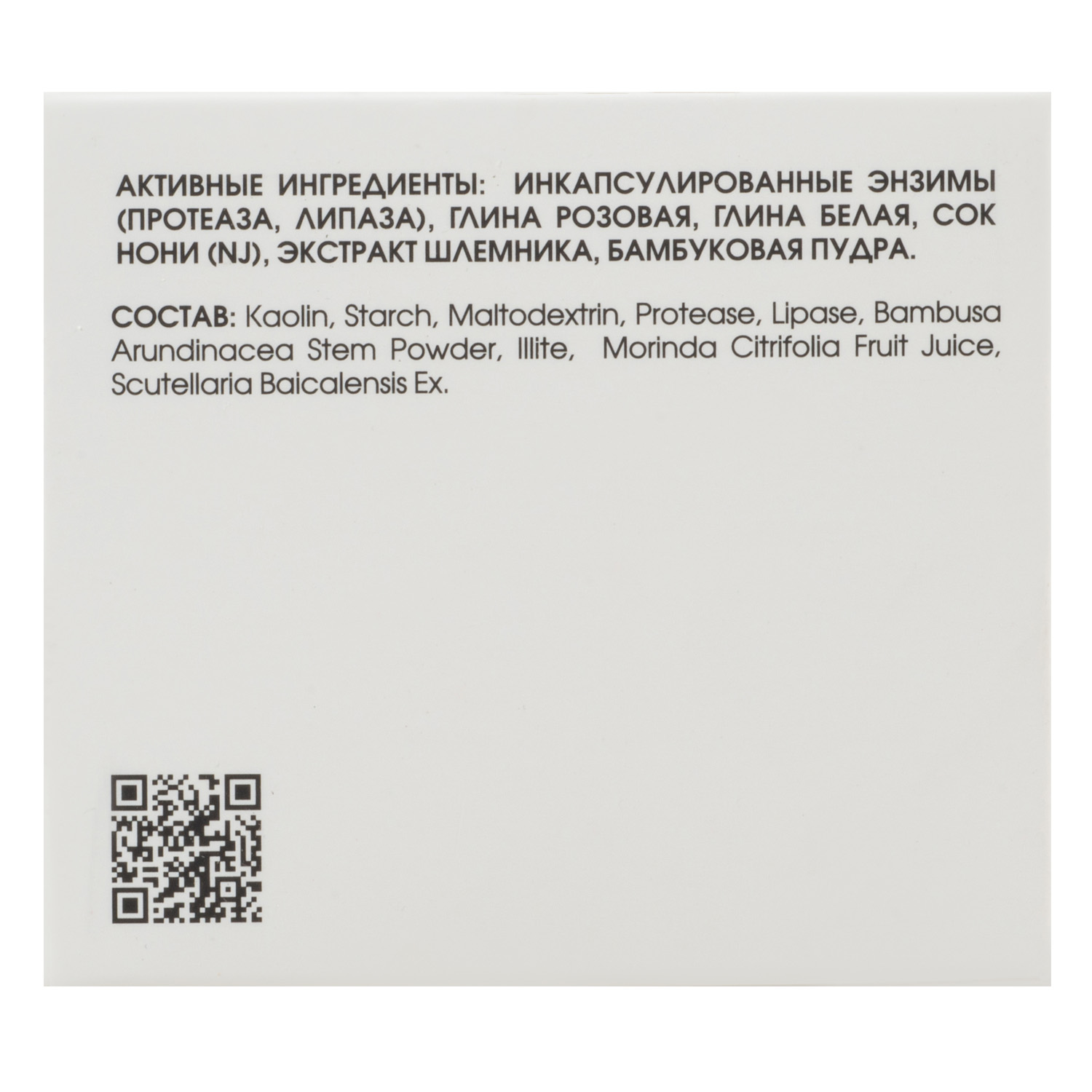 Состав: кaolin, starch, maltodextrin, protease, lipase, bambusa arundinacea stem powder, illite, morinda citrifolia fruit juice, scutellaria baicalensis extract.