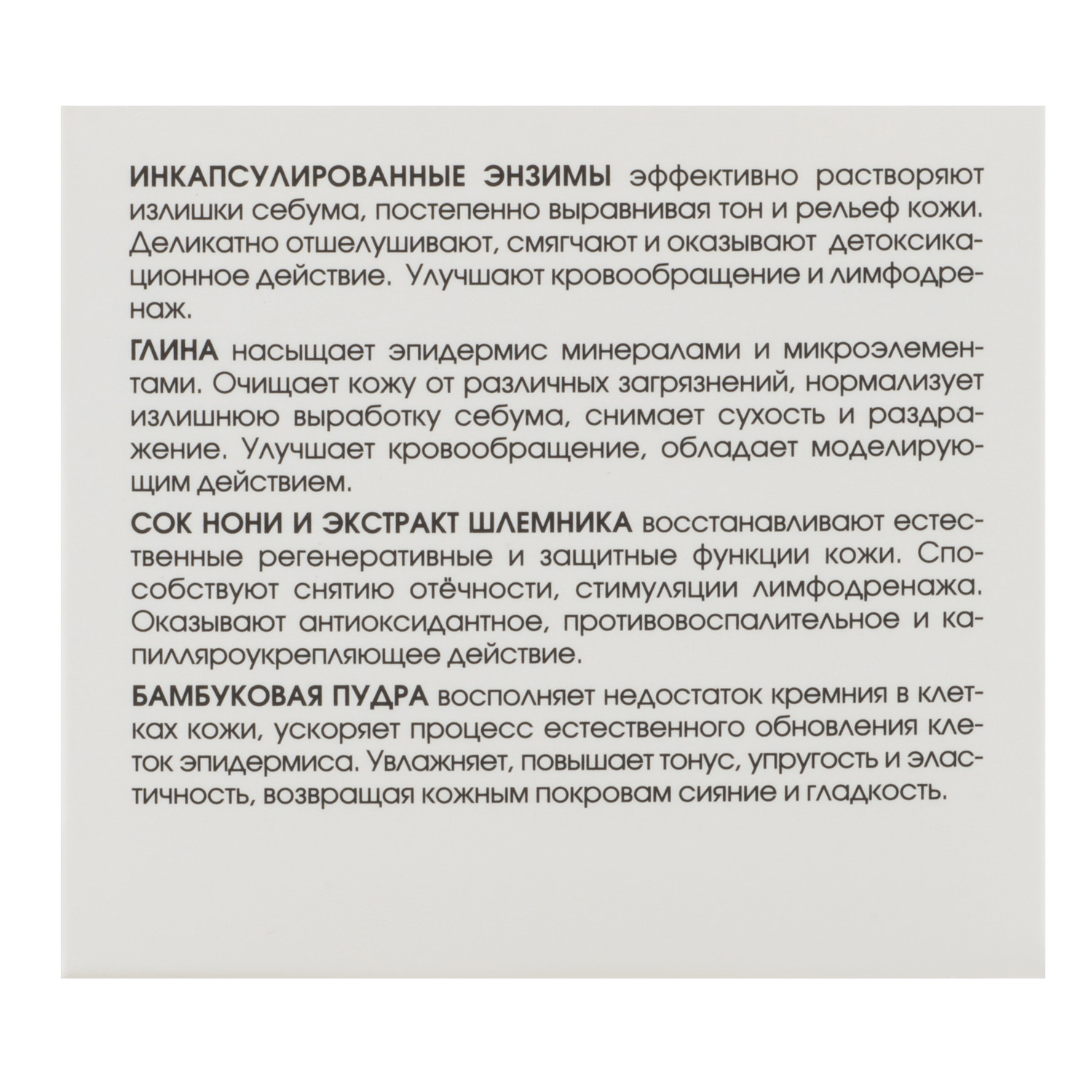 - инкапсулированные энзимы (протеаза, липаза) — эффективно растворяют излишки себума, постепенно выравнивая тон и рельеф кожи, деликатно отшелушивают, смягчают и оказывают детоксикационное действие, улучшают кровообращение и лимфодренаж