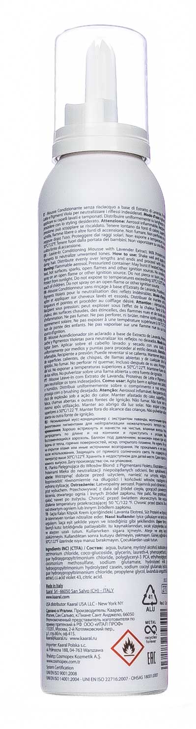 Мусс-кондиционер несмываемый с фиолетовыми пигментами для ухода за волосами. Pраспутывает волосы и улучшает их структуру нейтрализуя нежелательные тона. Сохраняет живой и блестящий цвет. Оживляет мелированные и осветленные пряди. Придает жизненную силу ослабленным и обезвоженным волосам. Для отбеленных и седых волос. Показания к применению: Pраспутывает волосы и улучшает их структуру нейтрализуя нежелательные тона. Сохраняет живой и блестящий цвет. Оживляет мелированные и осветленные пряди. Основные активные компоненты: Молочный протеин, пигменты фиалки, экстракт лаванды. Без парабенов, без силикона, без глютена. Способ применения: Хорошо встряхнуть, распределить на чистые, влажные волосы. Не смывать и уложить волосы. *Внешний вид товара может отличаться от фотографий на сайте.