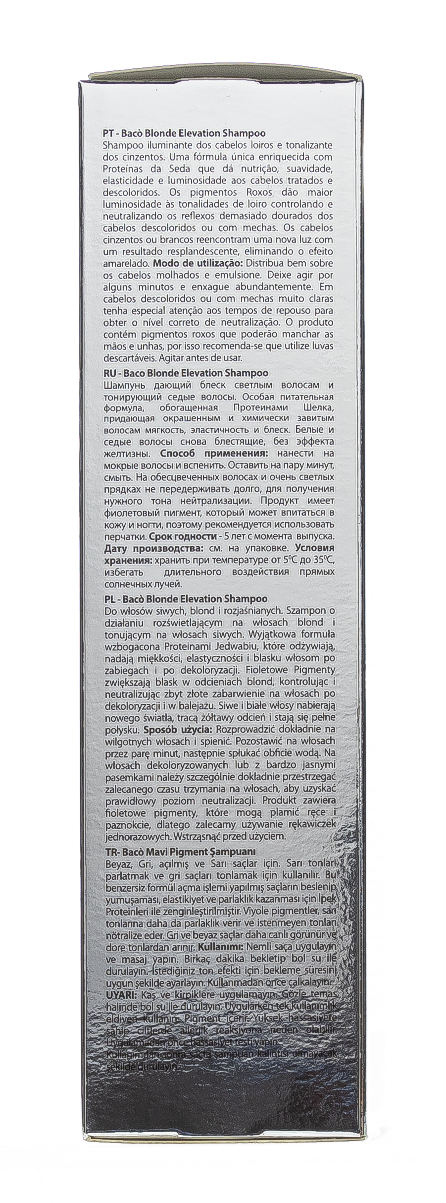 Тонирующий шампунь Kaaral Baco Blonde Elevation Shampoo создан для деликатного очищения седых волос и волос оттенков Блонд и устранения желтого оттенка. Особая формула шампуня смягчает, питает и возвращает эластичность химически обработанным осветлением волосам. Благодаря фиолетовым цветовым пигментам блокирует нежелательную желтизну, придавая седым и осветленным волосам благородный холодный оттенок. Показания к применению: Для деликатного очищения седых волос и волос оттенков Блонд и устранения желтого оттенка. Основные активные компоненты: Протеины шелка. Способ применения: Нанести небольшой объем шампуня на влажные волосы, вспенить, тщательно смыть теплой водой. *Внешний вид товара может отличаться от фотографий на сайте.