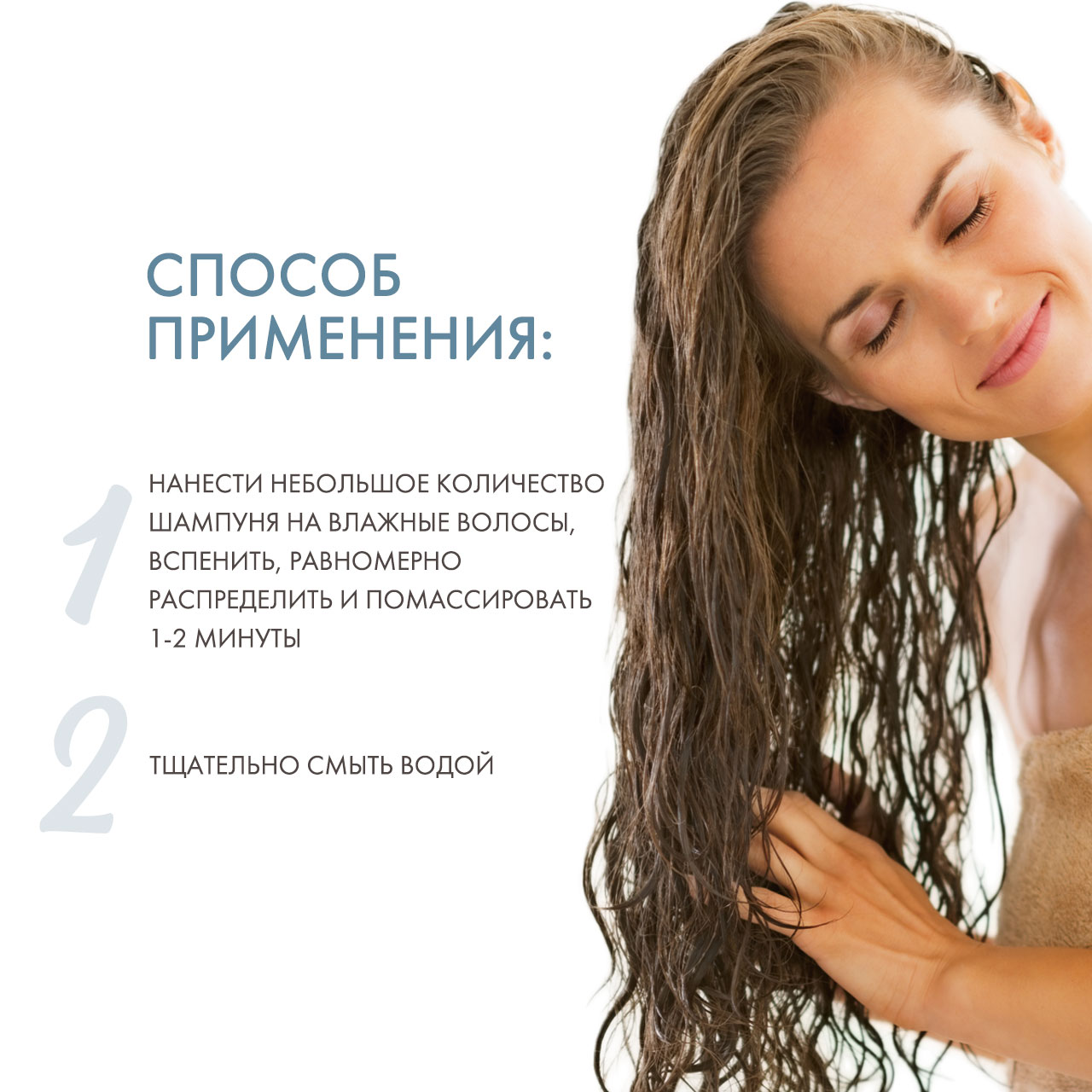 Нанесите небольшое количество шампуня на кожу головы и влажные волосы. Аккуратно помассируйте кожу, затем тщательно смойте теплой водой. Повторите при необходимости