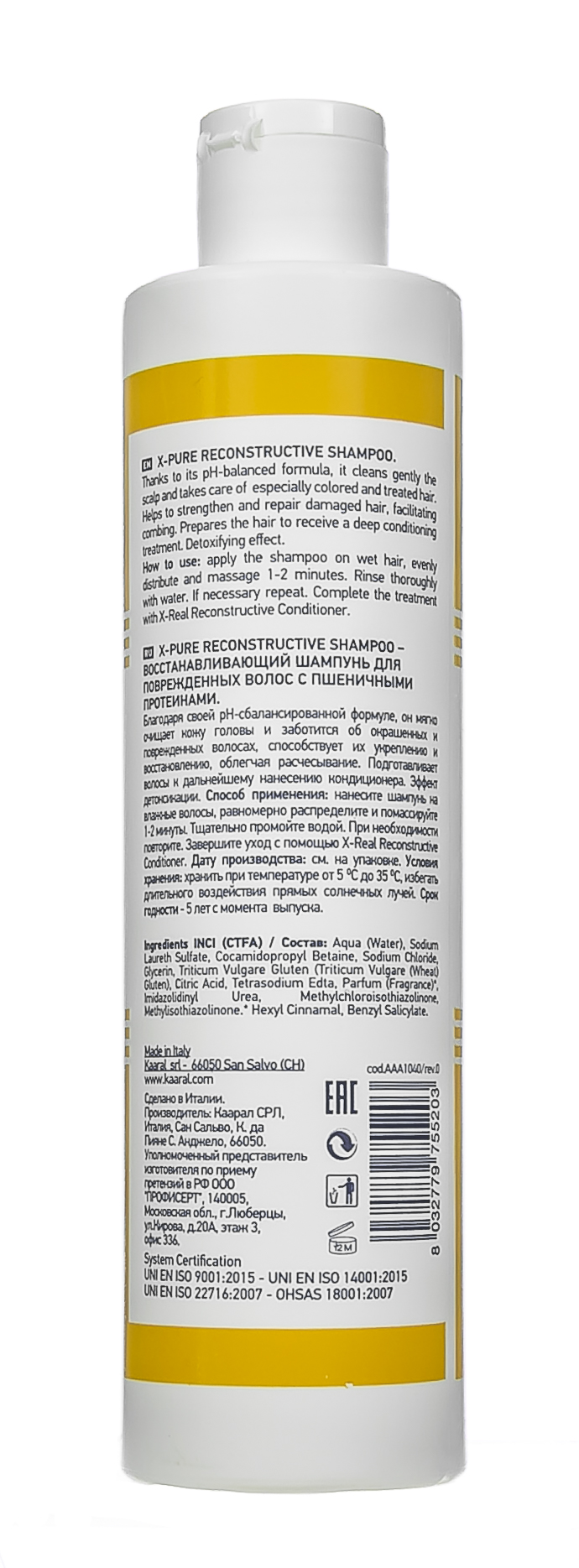 Шампунь Kaaral X-Pure Reconstructing Shampoo предназначен для бережного очищения и максимального уровня ухода за поврежденными химическим воздействием, ослабленными и ломкими волосами. Благодаря высокому содержанию в составе продукта протеинов пшеницы и маточного молочка он быстро приводит локоны в порядок, возвращает им приятную мягкость, гладкость и живой насыщенный блеск. Прекрасно удаляет с волос и кожи головы все виды загрязнений, при этом не затрагивает искусственный красящий пигмент в структуре локонов. Мягкая щадящая формула позволяет цвету окрашенных прядей оставаться ярким и глубоким, даже при частом мытье головы. Легкий кондиционирующий эффект средства значительно облегчает укладку и расчесывание, снимает статическое электричество. Показания к применению: Восстанавливает волосы на уровне структуры, придает им упругость и гладкость, окутывает каждый волосок неощутимым защитным барьером, препятствующим дегидрации и защищающим от негативного влияния UV-излучения. Основные активные компоненты: Входит ухаживающий комплекс, основанный на сочетании протеинов пшеницы и пчелиного маточного молочка. Способ применения: На влажные волосы нанести достаточное количество шампуня. Вспенить легкими массажными движениями. Смыть водой. *Внешний вид товара может отличаться от фотографий на сайте.
