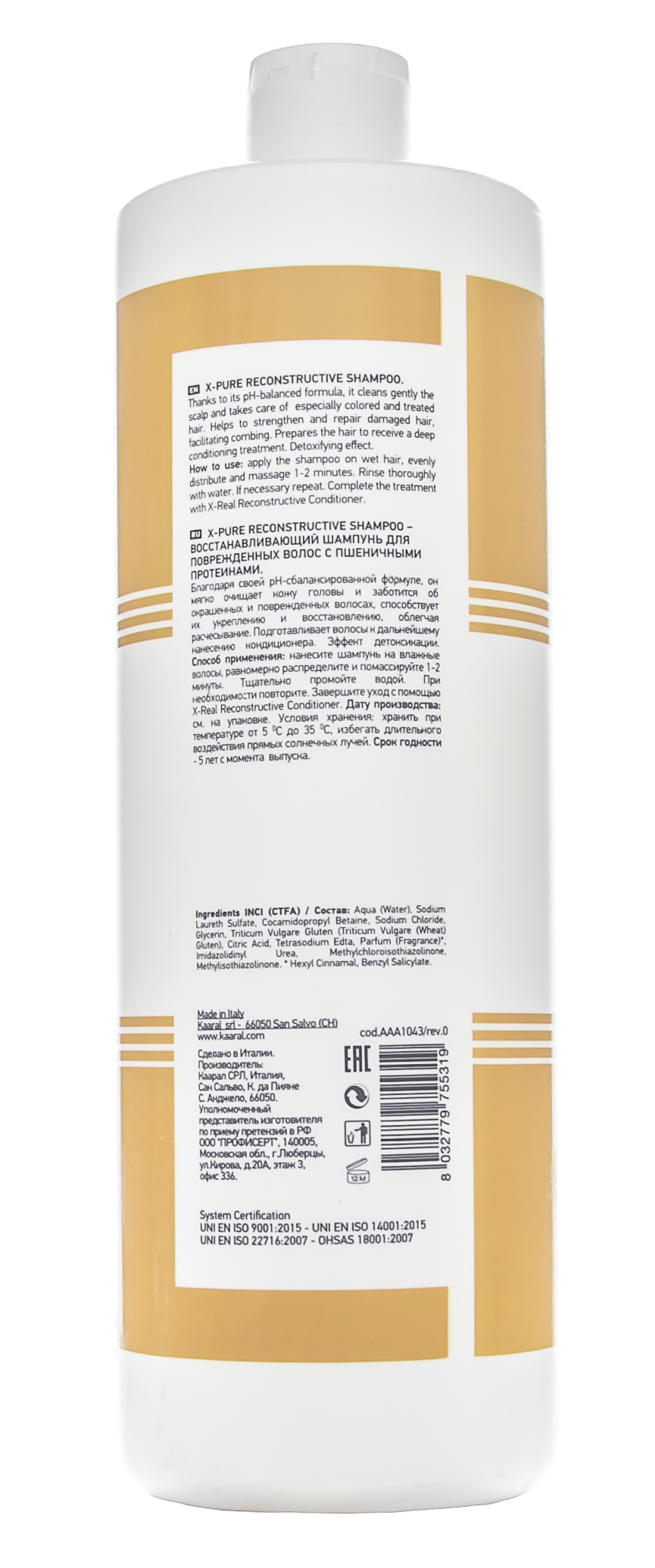 Шампунь Kaaral X-Pure Reconstructing Shampoo предназначен для бережного очищения и максимального уровня ухода за поврежденными химическим воздействием, ослабленными и ломкими волосами. Благодаря высокому содержанию в составе продукта протеинов пшеницы и маточного молочка он быстро приводит локоны в порядок, возвращает им приятную мягкость, гладкость и живой насыщенный блеск. Прекрасно удаляет с волос и кожи головы все виды загрязнений, при этом не затрагивает искусственный красящий пигмент в структуре локонов. Мягкая щадящая формула позволяет цвету окрашенных прядей оставаться ярким и глубоким, даже при частом мытье головы. Легкий кондиционирующий эффект средства значительно облегчает укладку и расчесывание, снимает статическое электричество. Показания к применению: Восстанавливает волосы на уровне структуры, придает им упругость и гладкость, окутывает каждый волосок неощутимым защитным барьером, препятствующим дегидрации и защищающим от негативного влияния UV-излучения. Основные активные компоненты: Входит ухаживающий комплекс, основанный на сочетании протеинов пшеницы и пчелиного маточного молочка. Способ применения: На влажные волосы нанести достаточное количество шампуня. Вспенить легкими массажными движениями. Смыть водой. *Внешний вид товара может отличаться от фотографий на сайте.