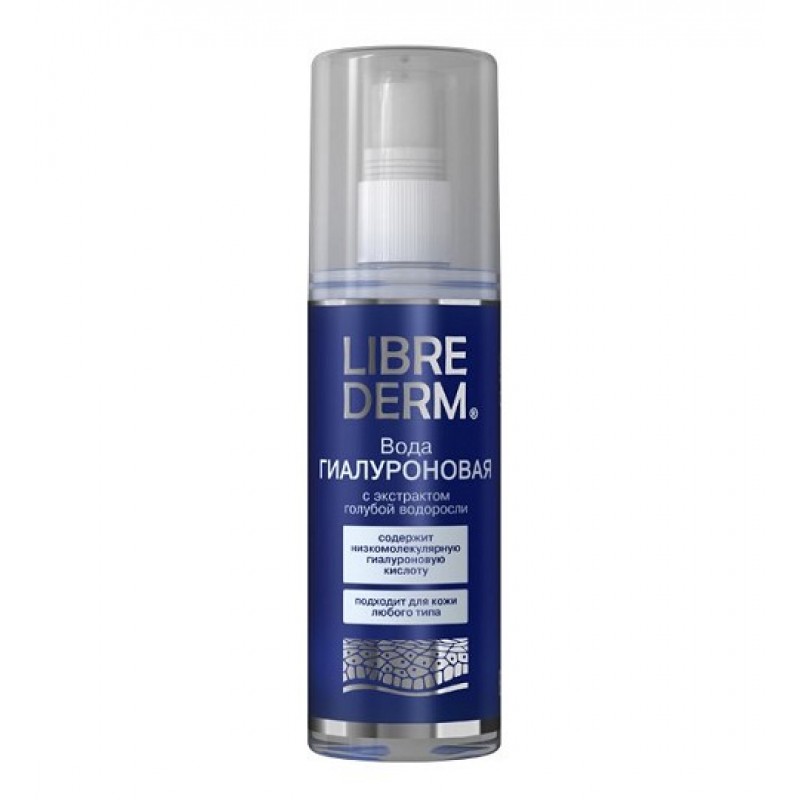 Содержит низкомолекулярную гиалуроновую кислоту – естественный увлажняющий компонент человеческой кожи, а также экстракт уникальной голубой водоросли, который имеет богатейший химический состав, содержащий огромное количество аминокислот, большой процент протеинов, липиды, витамины А, В1, В2, В3, минеральные соли меди и марганца. СОСТАВ: Вода деминерализованная, экстракт голубой водоросли Ланаблю, бета-глюкан овса, гиалуронат натрия (гиалуроновая кислота), метилхлороизотиазолинон и метилизотиазолинон. ПРИМЕНИЕ: Рекомендуется распылять гиалуроновую воду LIBREDERM на кожу утром и вечером после очищения, а также в течение дня для создания ощущения свежести