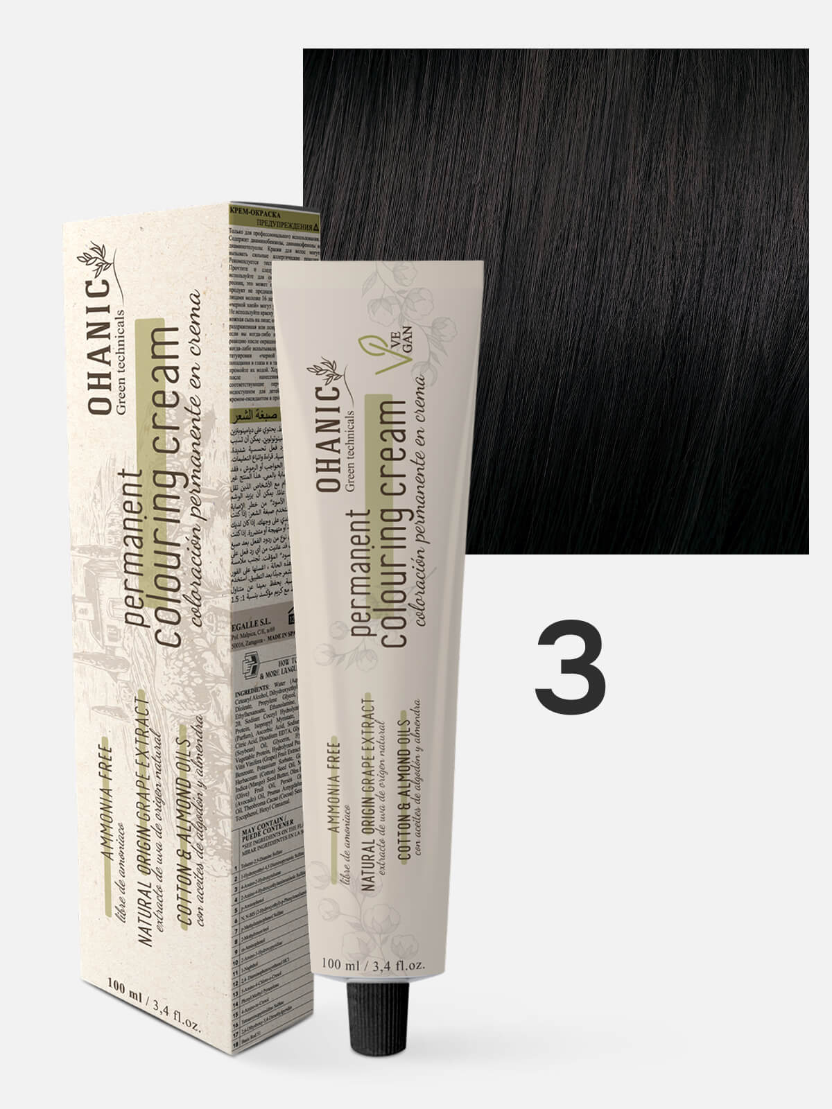 OHANIC GREEN TECHNICALS Крем-краска безаммиачная для волос PERMANENT COLOURING CREAM AMMONIA FREE 3 темный каштан натуральный 100мл