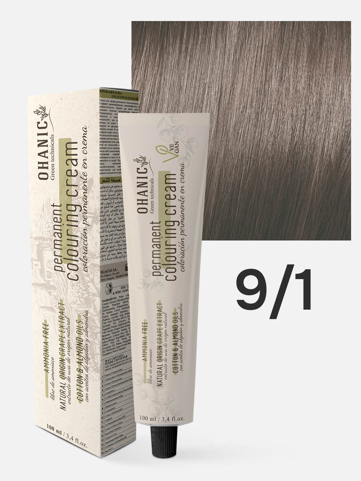 OHANIC GREEN TECHNICALS Крем-краска безаммиачная для волос PERMANENT COLOURING CREAM AMMONIA FREE 9.1 очень светлый блонд пепельный 100мл