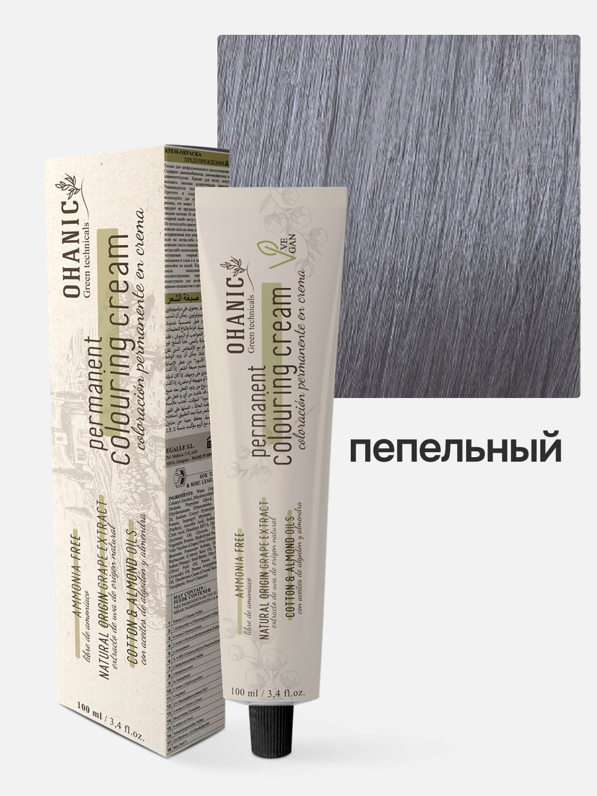 OHANIC GREEN TECHNICALS Крем-краска безаммиачная для волос PERMANENT COLOURING CREAM AMMONIA FREE ASH пепельный микстон 100мл