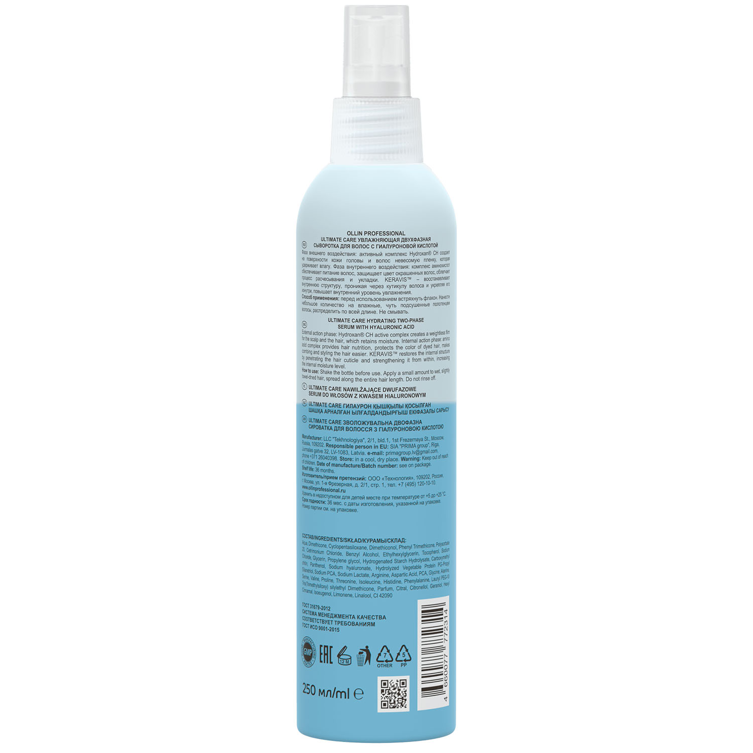Ollin Professional Ultimate Care Увлажняющая двухфазная сыворотка для волос с гиалуроновой кислотой 250 мл