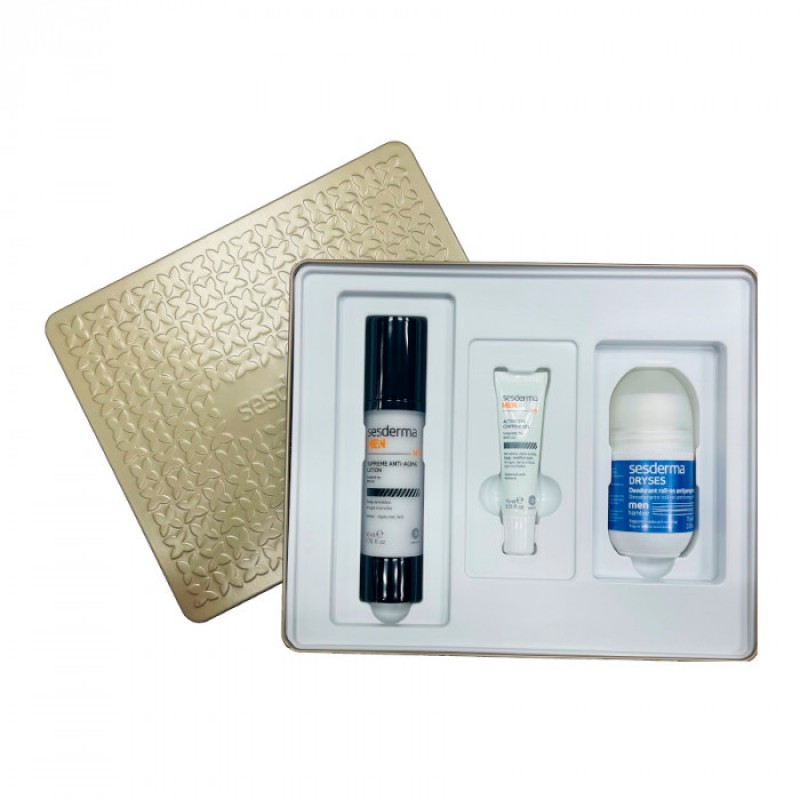 Антивозрастной лосьон MEN Supreme предназначен специально для мужской кожи. Средство на основе гиалуроновой кислоты, Системы 3-Retinol в липосомированной форме с цинком, ресвератрола и Витамина С помогает предотвратить признаки усталости, уменьшить морщины и пятна на зрелой коже. Обеспечивает повышенную эффективность благодаря нанотехнологиям. Ультралегкая текстура + anti-age сила больше, чем у более насыщенных кремов. Гель для век MEN Active Eye предназначен специально для мужской кожи. Средство на основе гиалуроновой кислоты, Системы 3-Retinol в липосомированной форме с цинком, ресвератрола и Витамина С помогает предотвратить признаки усталости, морщины вокруг контура глаз, а также уменьшает мешки под глазами и тёмные круги. Дезодорант-антиперспирант DRYSES на основе хлоргидрата алюминия, бисаболола и триклозана уменьшает потоотделение в подмышечной области и подавляет неприятный запах тела, не раздражает кожу, поддерживает кислотный баланс кожи. Обладает тройным действием: антиперспирантным, дезодорирующим и освежающим, обеспечивая пролонгированный эффект в течение 24 часов. Средства разработаны с использованием технологии NANOTECH™. Ее уникальность заключается в использовании активных ингредиентов, помещенных в липосомы наноразмера, – маленькие липидные контейнеры, позволяющие компонентам в кратчайшие сроки проникать в глубокие слои кожи и тем самым повышать эффективность средства. Показания к применению: Регулирует работу сальных желез, обладает защитными свойствами, стимулирует выработку коллагена и борется с действием свободных радикалов, а также успокаивает кожу. ресвератрол – мощный антиоксидант, действующий на клеточную ДНК и защищающий ее от старения. Влияет непосредственно на гены, стимулируя процессы омоложения клеток. Основные активные компоненты: Система 3-Retinol в липосомированной форме, цинк, липосомированная гиалуроновая кислота, витамин С, хлоргидрат алюминия 14%, триклозан 1%, бисаболол 0,2%. Способ применения: SESDERMA MEN Лосьон антивозрастной Supreme — наносить на кожу лица легкими массажными движениями утром и/или вечером. SESDERMA MEN Гель для век — наносить на кожу вокруг глаз избегая подвижное веко. утром и/или вечером. DRYSES Дезодорант-антиперспирант — нанести на чистую кожу в области подмышек, оставить до полного высыхания. Использовать один раз в день. *Внешний вид товара может отличаться от фотографий на сайте.