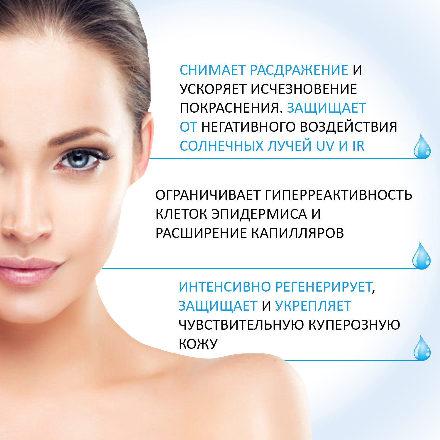 Интенсивно регенерирует, защищает и укрепляет чувствительную куперозную кожу. Ограничивает гиперреактивность клеток эпидермиса и расширение капилляров. Снимает раздражение и ускоряет исчезновение покраснения. Защищает от негативного воздействия солнечных лучей UV и IR.